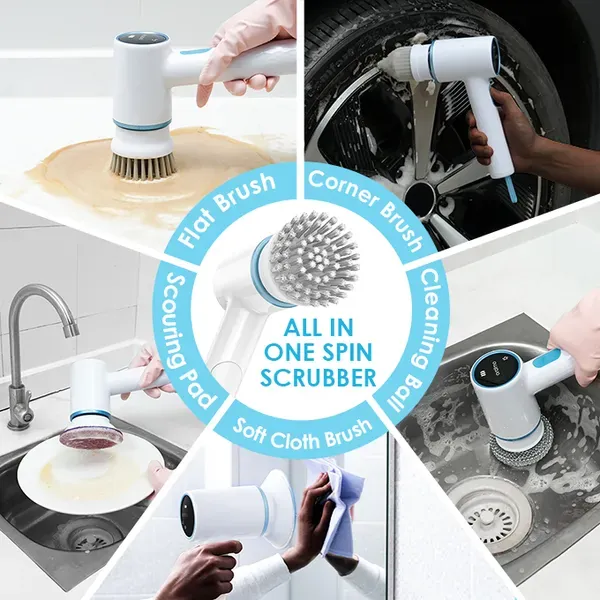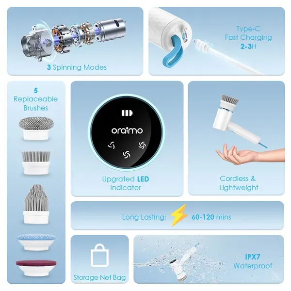 oraimo mini spin scrubber tackles more cleaning challenge. The flat brush is suitable for bathtubs or sinks, floors, and tiles. The pointed corner brush is great for cleaning window sill, corners, and tight places, even bicycle wheels. The scouring pad is ideal for cleaning the oven, and stove. The cloth brush is ideal for flat surface cleaning and drying, or glass cleaning. The cleaning ball is ideal for pot, and plate cleaning.