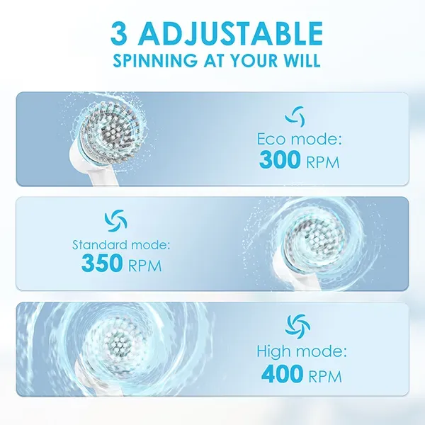 Unlike other electric spin scrubbers that only have one speed and the power is limited; oraimo Electric Spin Scrubber has 3 adjustable spin speeds, cleaning soap scum, grout, or stubborn stains in a few minutes. Click once to select the low speed of 300 RPM mode for the daily cleaning, just press the speed button once to switch to 350 RPM or 400 RPM mode for deep cleaning.