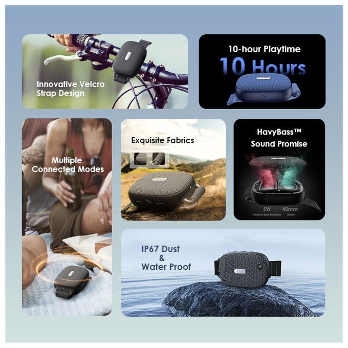 This speaker is fantastic! The unique Velcro strap lets me attach it anywhere, and the HavyBass sound is surprisingly powerful for its size. It's now my go-to for hikes and bike rides.