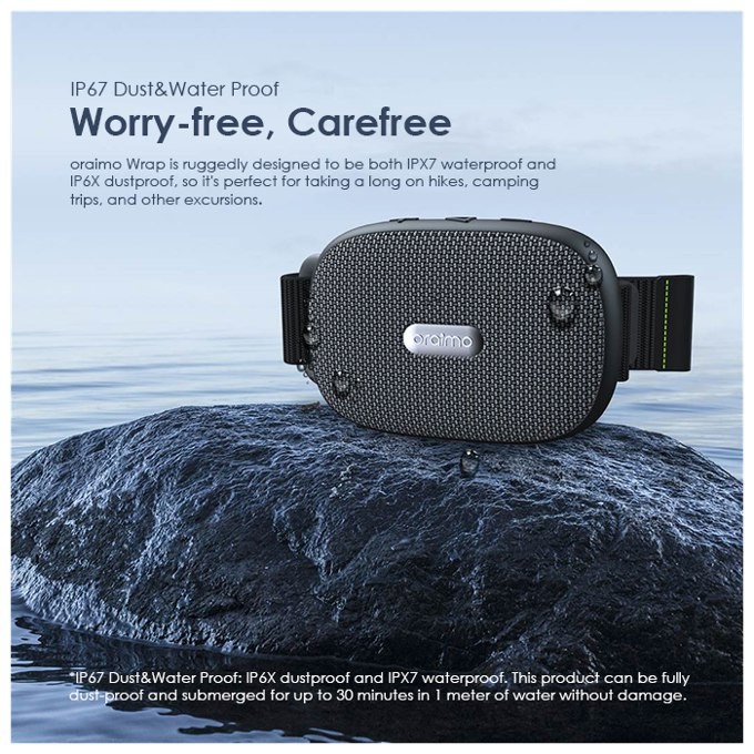 IP67 Dust & Water Proof: Built to withstand outdoor adventures, the oraimo Wrap is IPX7 waterproof and IP6X dustproof. Whether you're hiking, camping, or relaxing by the pool, you can enjoy your music worry-free.