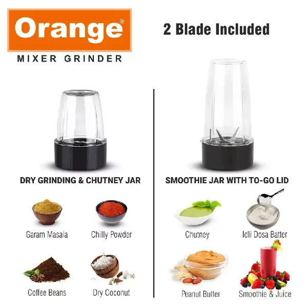 - Dual Jar System: Includes a 500ml long jar for blending and a 300ml short jar for grinding dry spices and chutneys.