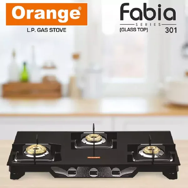 The Orange Fabia 301 Jumbo OLPG253 is a 3-burner LPG gas stove designed for modern kitchens. It combines a durable toughened glass top with efficient brass burners, offering reliable performance, versatile cooking, and a sleek aesthetic for everyday culinary tasks.