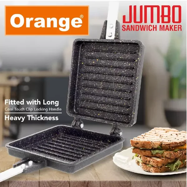 The Orange Jumbo Sandwich Toaster (Model ONSC081) is a versatile kitchen appliance featuring a durable non-stick granite coating. Its jumbo size and multi-function design make it perfect for creating toasted sandwiches, paninis, and even waffles with ease and minimal cleanup.