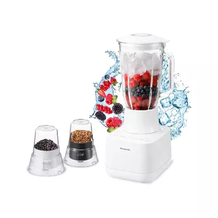 Precisely Crushed Ice – Enjoy the Difference. Blender MX-MG5321 provides enjoying home-made healthy meal, treats, and drinks with kids. With its tough blades and powerful circulation, you can easily make cold fruit desserts, and healthy vegetable and fruits smoothies. Key Features: Finely Crushed Ice for Healthy Homemade Treats Enjoy healthy snowy crushed ice drinks and dessert by blending fruits and ice together for a naturally sweet and refreshing treat. Crush up to 250g of ice cubes* at a time! *For a piece of ice cube size approx. 8-10g made by a household refrigerator. Efficient Ice Shaving The four blades are designed asymmetrical to increase the cutting range by preventing the blades from rotating around the same locus. The combination of this large range of motion and the optimised blade shape results in finer and more consistent shave. Durable Sawtooth Blades for Powerful Crushing The unique blades are optimized to efficiently prepare various ingredients. 1. HEIGHT: Easier to come in contact with food. 2. THICKNESS: Easily grinds food with high durability. 3. SHARPNESS: Efficiently cut food. 4. SAWTOOTH BLADES: Capture and cut food into finer pieces to create a smooth texture. Get Nourished with Silky Delicious Smoothies Enjoy delicious, wholesome, fruit & vegetable smoothies! The combination of the four ribs on the inner surface of the jug and the optimally shaped blades blend food dynamically, allowing hard and small foods to be crushed evenly. Unique Blade and Powerful 700 W Motor Lifts Ingredients Panasonic blender can blend food even in small amounts relatively cleanly as the food is circulated. Optimised Shape of Jug Makes Dynamic Circulation Lifted ingredients hit the jug wall and drop onto the bottom blades. Thanks to the unique conical jug shape, the ingredients are lifted and spread up the side of the jug, fall and settle in the centre. The Four Ribs Catch the Ingredients, Making Them Easier to Cut The gaps between the ribs and blades are adjusted and designed in a well-balanced way to prevent the blades from sustaining significant damage while chopping ingredients finely. 2 Dry Mills for Freshly Grinded Spices, Nuts or Coffee Beans It comes with two dry mill attachments. You can use them more hygienically by separating mills for different purposes. Speed Control Lets You Create a Variety of Menus Blends with optimal speed to suit different menus. Speed 1 and 2 operate at a constant speed for a smooth finish. Pulse 1 and 2 operate while the button is pressed for a customised finish. Specifications: Brand: Panasonic Model: MX-MG5321WTN Type: Blender Power: 700 Watts Power Consumption: 360-400 W Capacity: 2.0/1.5L Rotation Speed: 11000 RPM 2 speed settings 2 dry grinders (spice mix or coffee) Soft Ice Crusher – Durable Serrated Blades Cutter Material: Stainless Steel Switch Control: Off/ 1/2/P1/P2 Fast grinding: Yes Ease of use: Yes Safe lock: Yes Glass Jug: Yes Color: White Dimentions: W×D×H (Approx.) 186 x 200 x 425 mm Attachment: Scraper Height: 425 mm Width: 186 mm Depth: 200 mm Weight: 3.3 kg