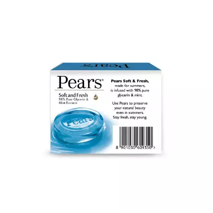 Does your skin crave for a fresh glow in summer months? Presenting Pears Soft & Fresh bar that combines the signature mild formula of 98% pure glycerine with the refreshing scent of mint that cools and revitalises your senses. It’s a perfect solution to keep your skin feeling refreshed and moisturised so that you can get a Fresh Glow, even in the harsh months of summer. Pears is a traditionally crafted soap that leaves out the impurities and gives you the purest bathing bar. Its unique formula maintains your skin’s moisture and hydration, leaving your skin feeling refreshed and glowing. It also washes away germs without being harsh on your skin. This bar is gentle enough to be used not only for the body, but also as a facial cleanser and handwash. To use, moisten the bar with water and work it into a light lather between your hands. Massage onto your face and body before rinsing thoroughly. For best results, use twice a day. Also try the Pears Soft & Fresh Body Wash that is pH balanced and dermatologically tested. Add the Pears Range to your beauty regime for a fresh, glowing skin!