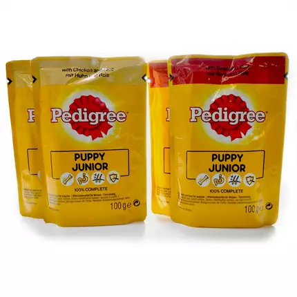 Pedigree puppy pouch multi-pack with 2 tasty flavors in jelly, Chicken & Rice and Beef & Rice, is designed for your growing pup. From Vitamin E to help build their immune system, to protein that is gentle on their sensitive tummies. Tasty, complete wet puppy food, that makes for a great treat for your puppy.