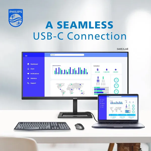 Simplify your connections with USB-C. The Philips E line UltraWide display offers expansive panoramic visual. WQHD display and ergonomic stand guarantee the optimal viewing conditions. Features like all-in-one USB-C, built-in USB Hub, and MultiView help boost up productivity.