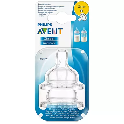The Philips Avent Anti-colic bottle range offers different teat flow rates to keep up with your baby's growth. Remember that age indications are approximate as babies develop at different rates. All teats are available in twin packs: Newborn, Slow, Medium, Fast and Variable Flow, and Thick feed.
