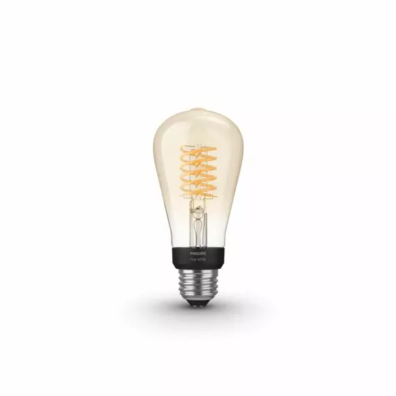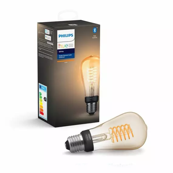 Philips Hue White Filament LED Bulb with Bluetooth With an elongated design and vintage feel, this Bluetooth-capable smart LED Edison bulb featuring a coiled filament can make a statement in any room. Use Bluetooth controls or pair with a Hue Bridge to unlock more smart lighting features. What's required? – nothing This product works out of the box with the free ‘Philips Hue Bluetooth app. Simply screw in your new Bulb and connect to the Bluetooth app for in-room smart lighting control Get started in no time – With no complex installation required you can start controlling your smart LED lights straight out of the box with your smart device or voice. Discover the easiest way to control your lighting Introducing new vintage designs - Smart filament bulbs, with their classic shapes and inner coils, add elegance and style to any room — Whether they’re off or on Control lights with your voice - Works with all echo smart speakers/displays and Google nest devices for hands-free voice control (Philips Hue bridge (sold separately) is required for Echo 1st Gen and echo Dot 1st Gen) Brighten and Dim Your Smart Lights - Wirelessly turn your lights up or down via the battery-powered dimmer switch v2 Installation-Free Control - Mount or stick the dimmer switch wall plate anywhere in your home and enjoy installation-free smart lighting control Remote Control - The Hue Dimmer switch is magnetic and can be removed from the base plate, allowing you to use the dimmer switch as a handy remote contro