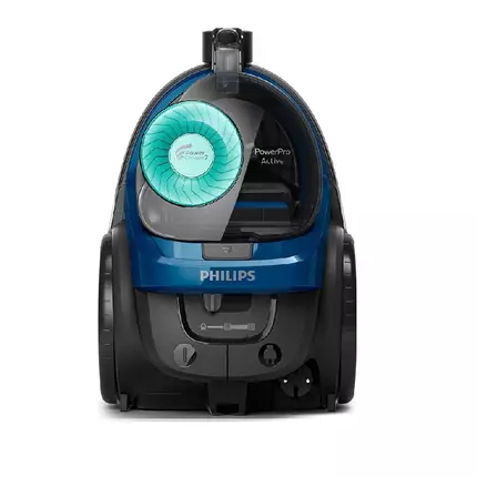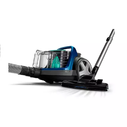 The Philips Bagless Vacuum 5000 Series is our most powerful compact vacuum. Achieve maximum deep cleaning results with minimum effort thanks to PowerCyclone 7 technology and TriActive nozzle which features 3 cleaning actions in one. Powerful 2000W motor for high suction power 2000 W motor generates max 410W suction power for a thorough clean every time. PowerCyclone 7 keeps strong suction power for longer PowerCyclone 7 technology features an aerodynamic design to minimize air resistance and ensure sustained strong suction power. Super accelerated air flow in the cylindrical chamber and unique exit blades effectively cut out the dust from the air. TriActive nozzle for 3-way thorough cleaning action TriActive nozzle utilizes 3 cleaning actions in one go. The specially designed soleplate removes dust from deep within carpets, while the large front opening sucks up big bits. Air channels and brushes on both sides of the nozzle pick up any dust and dirt alongside walls or furniture. Power control function to adjust suction power Power control function easily adjusts suction for different cleaning tasks, from hard floors to soft furnishings. Compact design with front and top handle for easy carrying Compact and lightweight design ensure both storing and lifting the vacuum is easy. The design includes top and front handles for effortless carrying. Dust container designed for hygienic emptying with one hand Easy-to-empty dust container is designed for hygienic disposal with one hand, to help minimize dust cloud. Soft brush integrated into handle & furniture nozzle Dusting brush tool is built into the handle so it's always ready to use on furniture, flat surfaces and upholstery. Furniture nozzle is designed for optimal cleaning of soft furnishings like cushions, couches and arm chairs, even removing pet hair. Soft bumper and rubber wheels to protect furniture Soft bumper and rubber wheels protect furniture and prevent floor scratches while being easy to maneuver around your home. Allergy H13 filter system captures >99.9% of fine dust Allergy H13 filter system catches >99.9% of fine dust particles - including pollen, pet hair and dust mites - ideal for allergy sufferers. Filtration level is equivalent to HEPA 13. Features: 2000 W PowerCyclone 7 TriActive nozzle Allergy H13 filter Technical Specifications: Standard nozzle: TriActive nozzle Accessories included: Crevice tool & Integrated brush Accessory storage: On tube clip Additional nozzle: Furniture nozzle Color: Dark Royal Blue Dimensions of product (LxWxH): 412 x 280 x 280 mm Weight of product: 5 kg Input power (IEC): 1700 W Sound power level: 72-82 dB Input power (max): 2000 W Suction power (max): 410 W Dust capacity: 1.5 L Exhaust filter: Allergy H13 filter Motor filter: Washable filter Filtration level: HEPA13 level Action radius: 9m Tube coupling: Active Lock Carrying handle: Top and front Power control: Electronic on appliance Tube type: Metal 2-piece telescopic tube Wheel type: Rubber