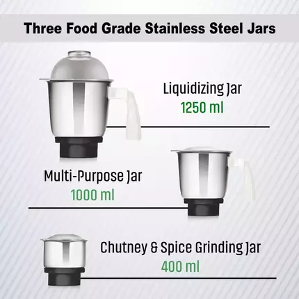 Wattage: 550 W; Voltage: 220-240V, 50-60Hz ; RPM : 19000 Number of Jars: 2; Jar material type: Stainless Steel; Multipurpose Jar: 1.25 L; Chutney jar: 0.4 L Anti- Shock and Anti-Rust ABS body and Ergonomically designed handles 2 year warranty on product and motor Speed Control: 3; Cord length: 1.74 m; Motor with an overload protector ISI Certified Mixer Grinder Includes: Mixer grinder, 2 jars, 2 lids, 1 warranty card Warranty: Mixer Grinder Comes with 1 year Warranty Specification Brand Pigeon Model Number Ivory Product Dimensions 30 x 25 x 30 cm; 6.9 kg Capacity 1.25 Liters Power / Wattage 550 watts Voltage 240 Volts Material Stainless Steel