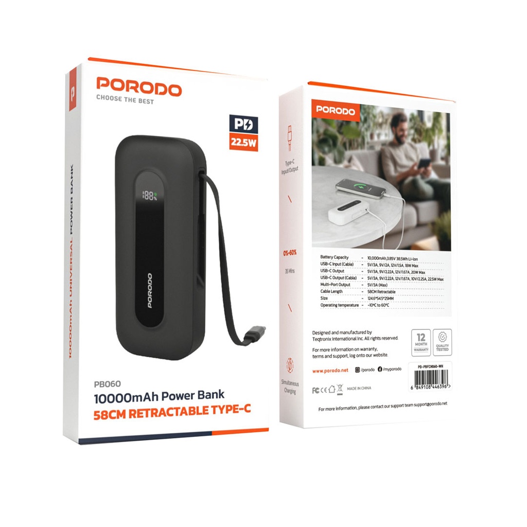 Porodo 10000mAh Power bank 58cm Retractable Type-C