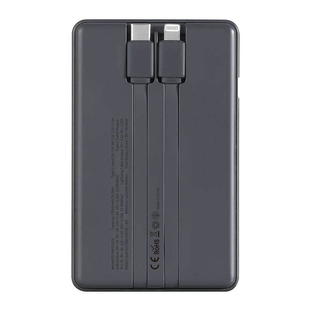 Porodo 10000mAh Slim Power Bank PD 22.5W with Built-in Type-C & Lightning Cables-Black