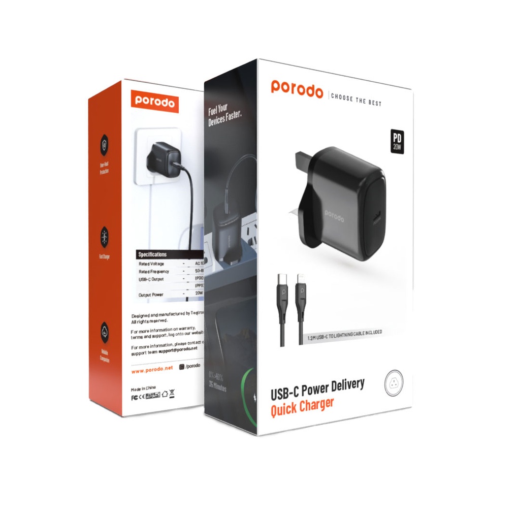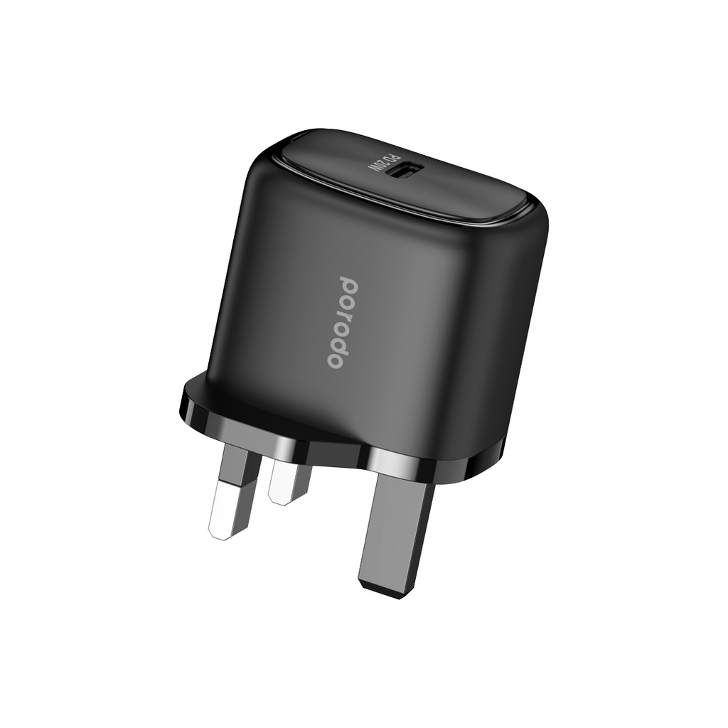 Porodo 20W Single USB C Charger UK With Type C to L Cable 1.2M - Black