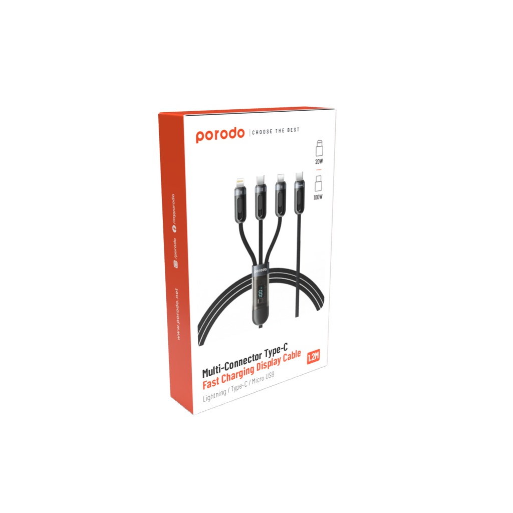 Porodo 3-IN-1 Digital-Display Fast Charging 1.2M Cable C to C+L+M - BLACK
