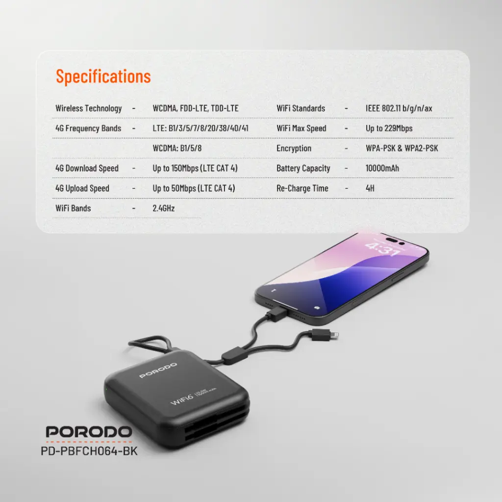 Porodo portable MiFi 3G/4G Router CAT4 V2 - Black