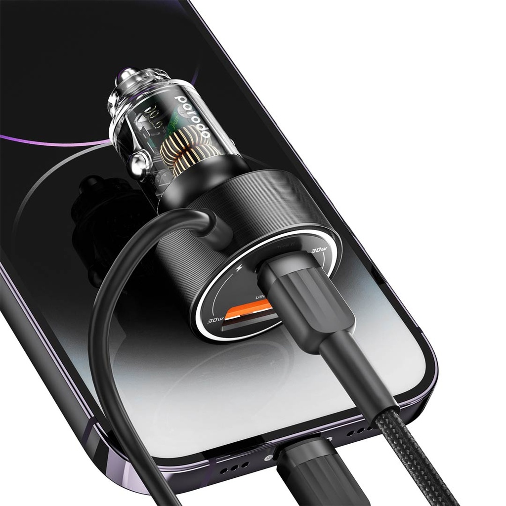 Porodo 60W Transparent Dual Port Car Charger PD 30W QC 18W with Coil- Black