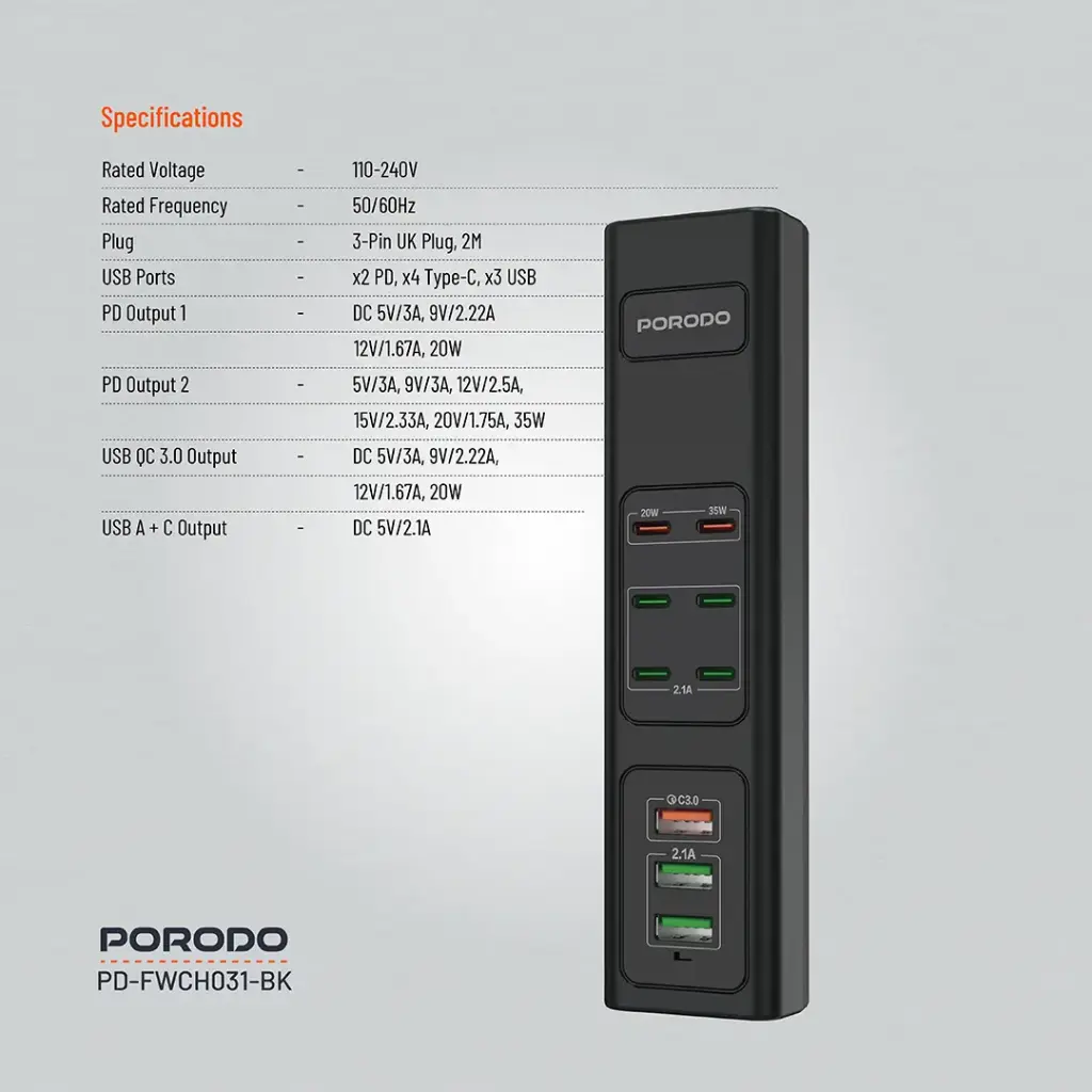 Porodo 85W Multi-Port USB Charging HUB - Black
