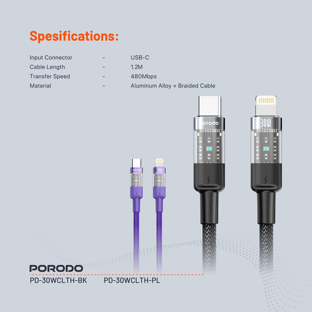 Porodo Braided 30W PD C to Lightning Fast Charging Cable with Transparent Head 1.2M