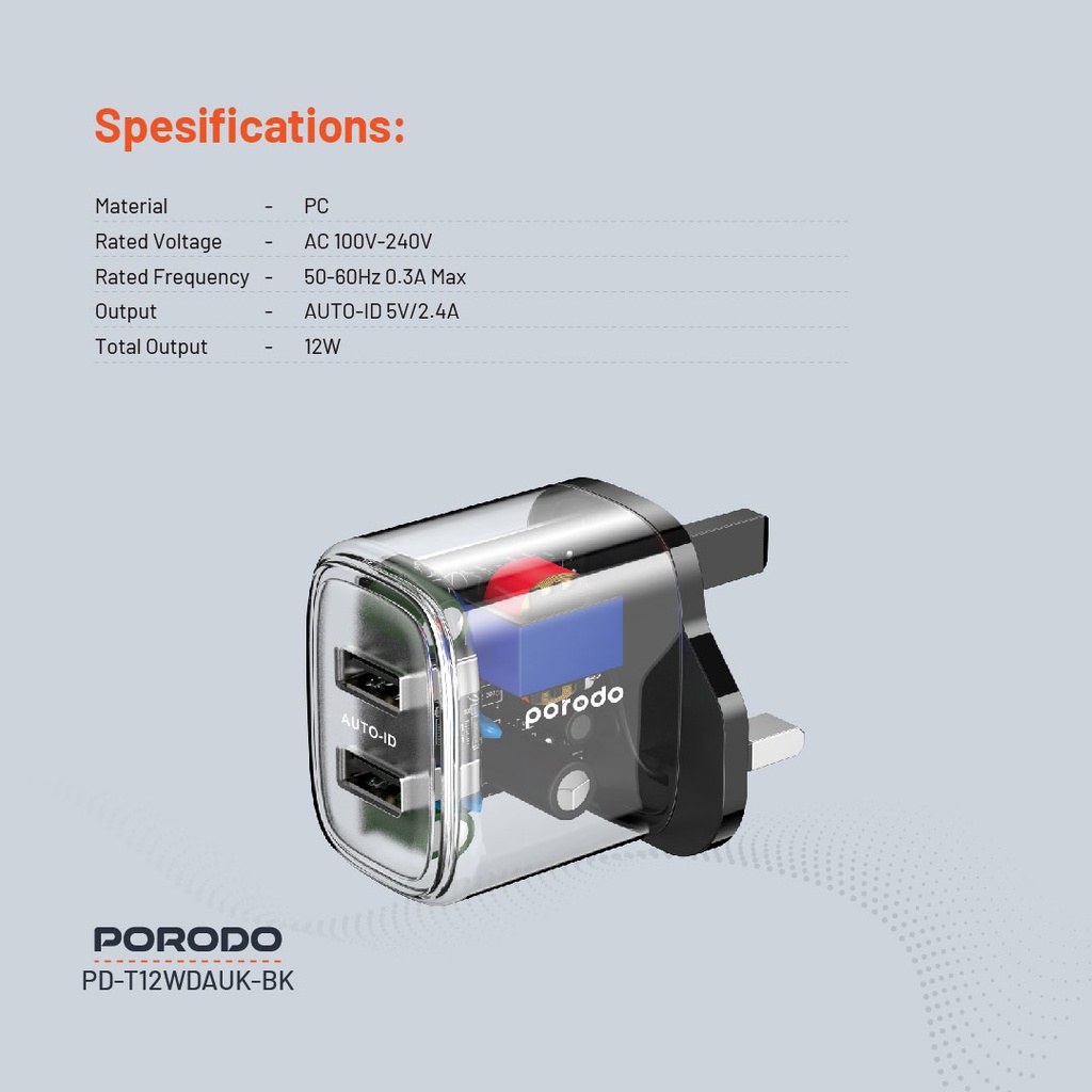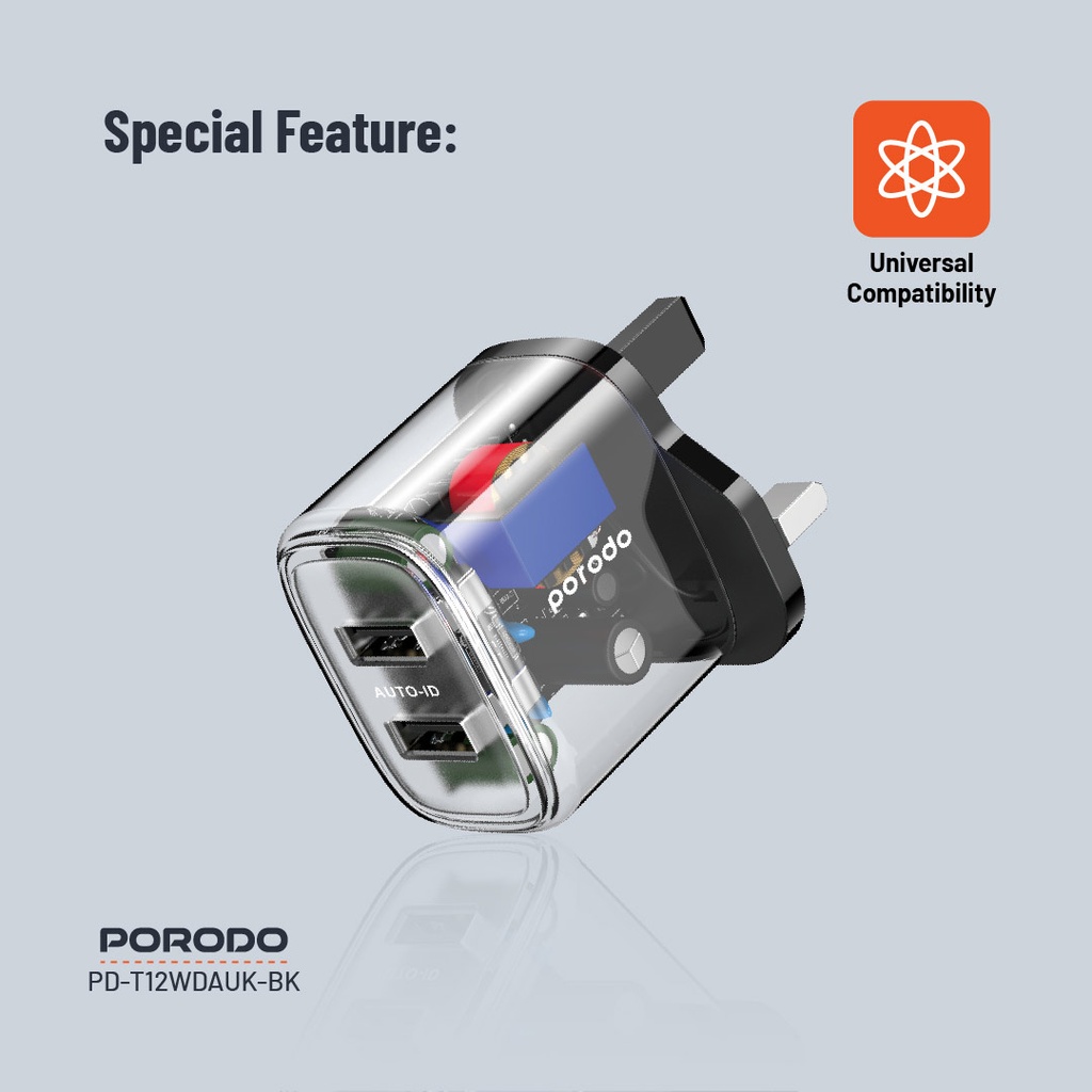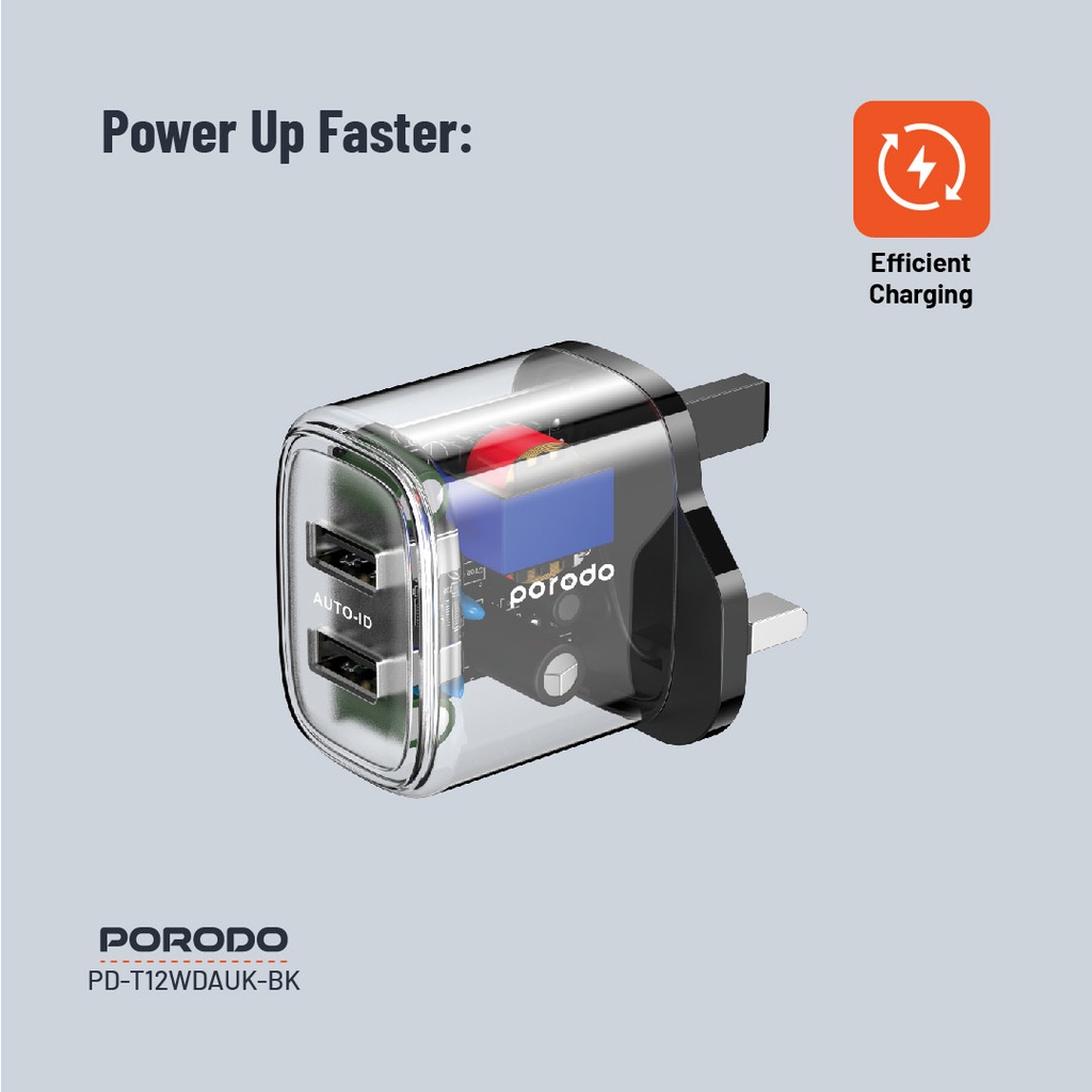 Porodo Dual Output Transparent Charger 2.4A UK - Black