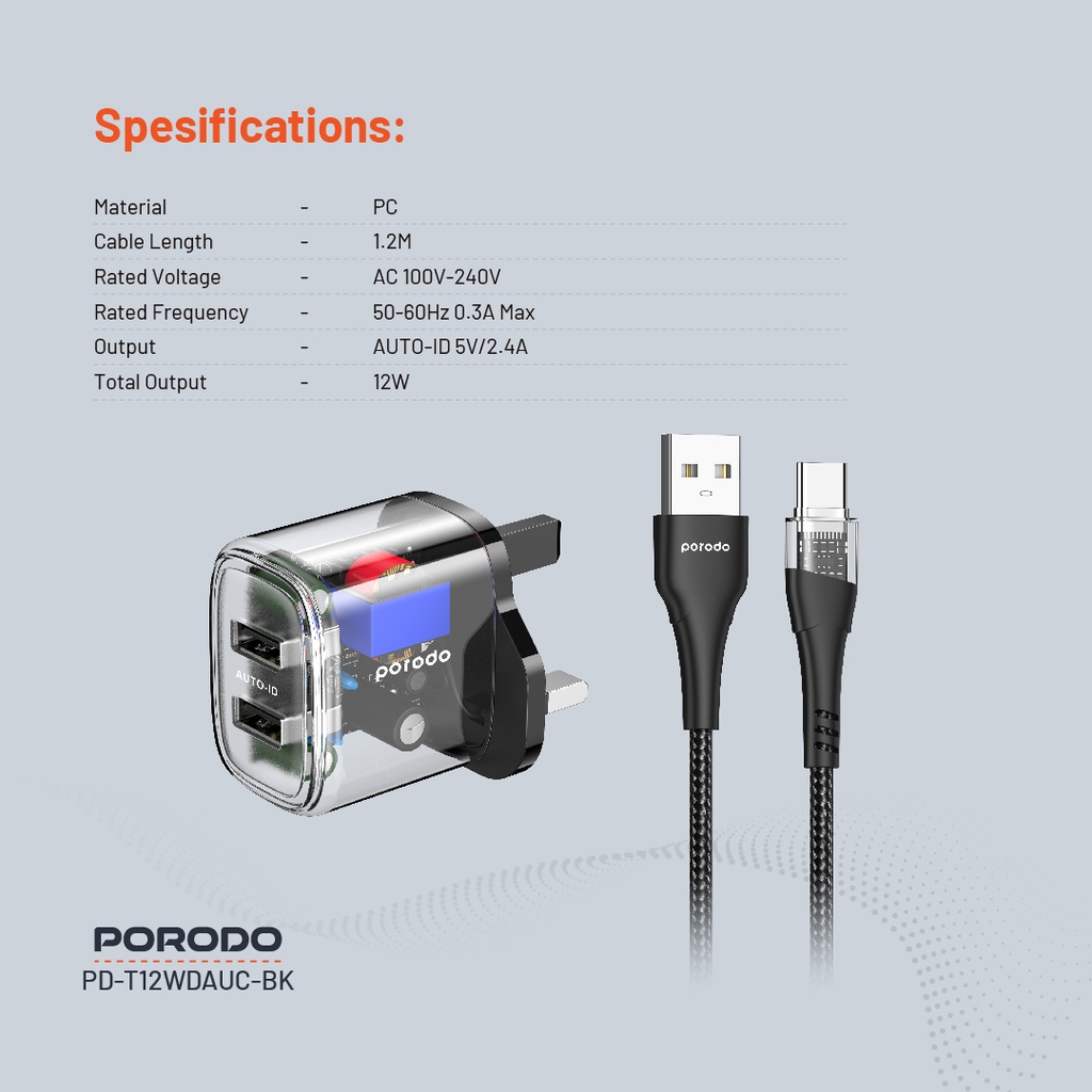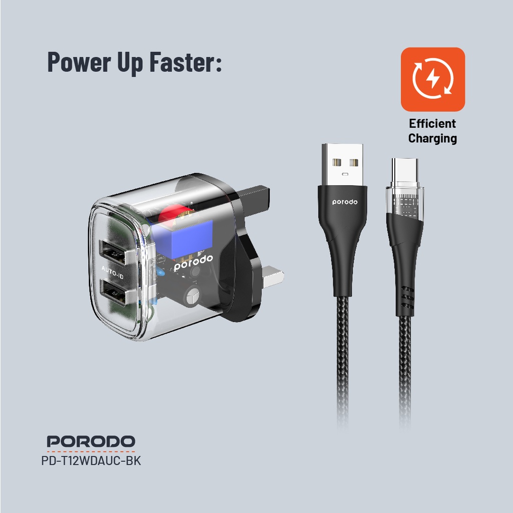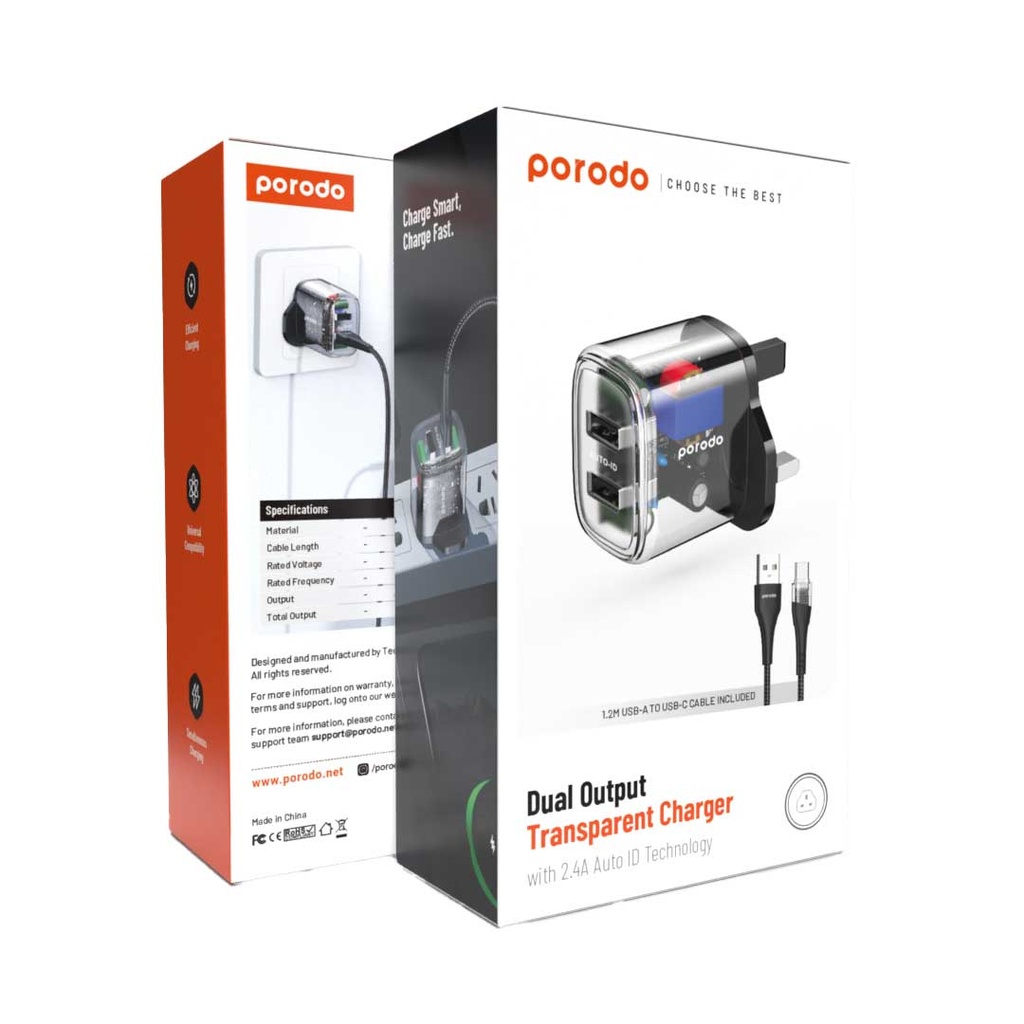 Porodo Dual Output Transparent Charger 2.4A UK with USB-A to USB-C Cable - Black