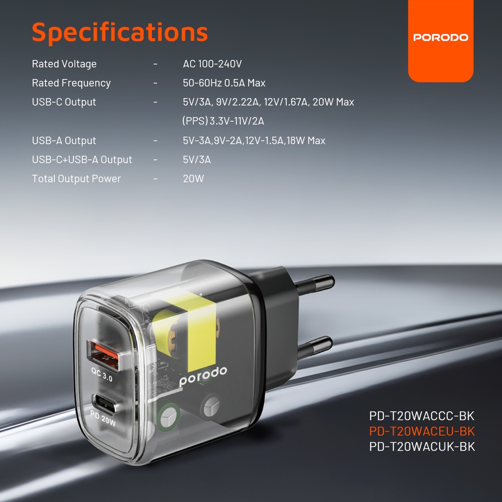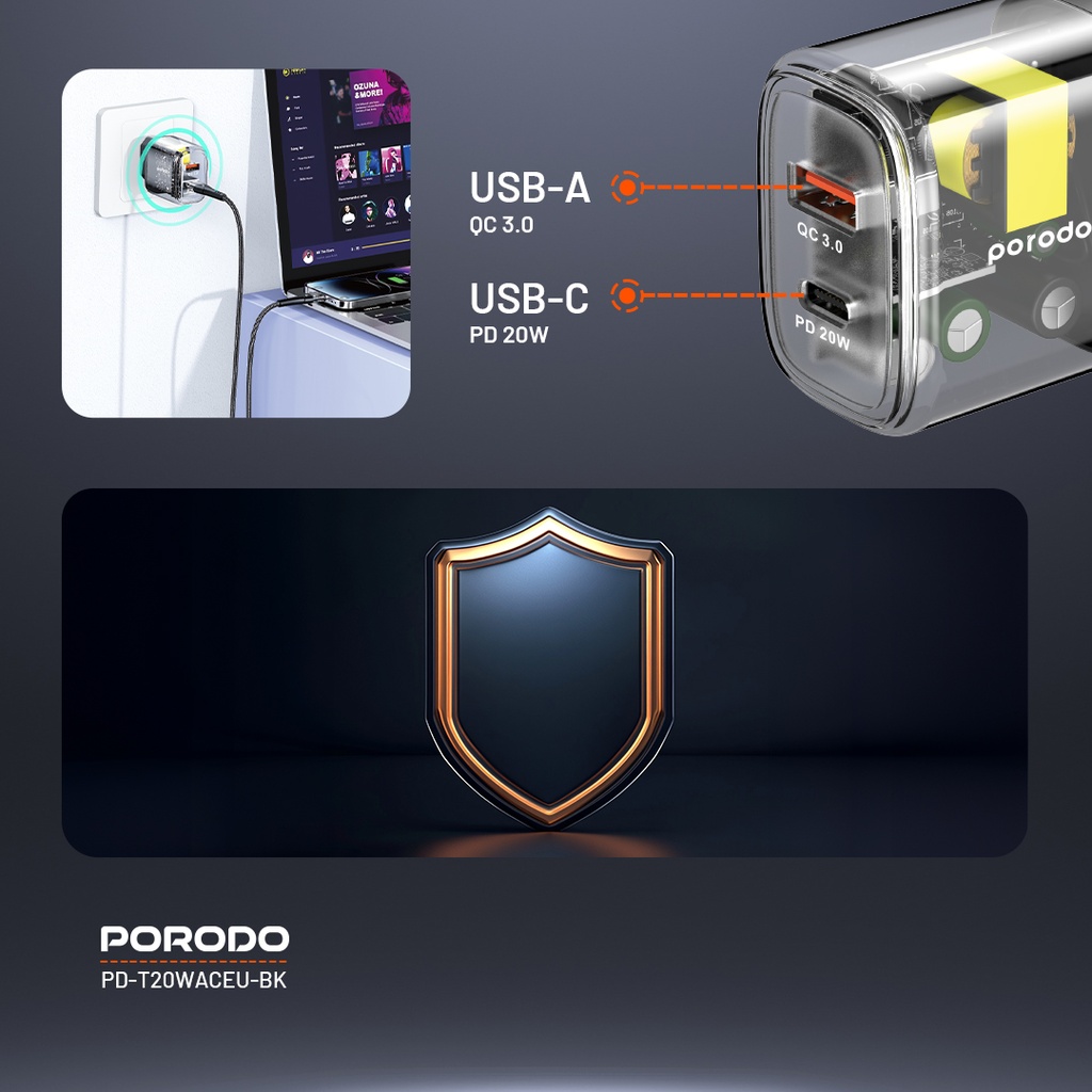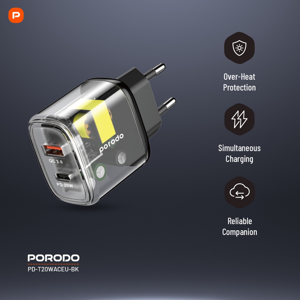 Porodo Dual Output Transparent Quick Charger PD 20W + QC 18W EU - Black