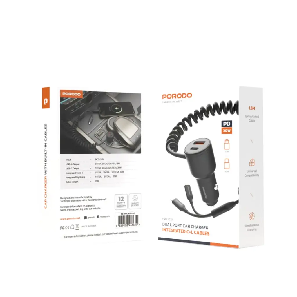 Porodo Dual Port Car Charger Integrated C+L Cables - Black