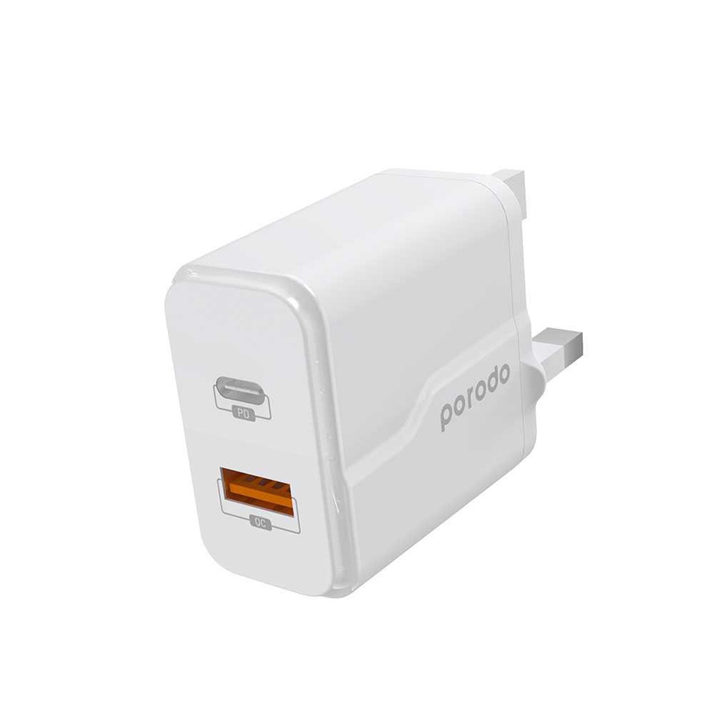 Porodo Dual Port Wall Charger PD 18W + QC3.0 UK with Braided Type-C to Lightning PD Cable 1.2m - White