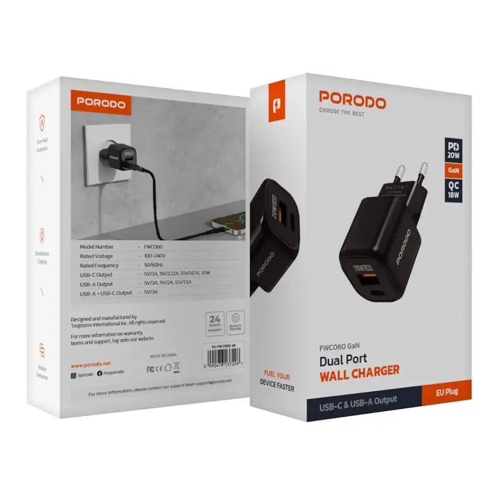 Porodo Dual Port Wall Charger (with C to C / C to L Cable) - Black
