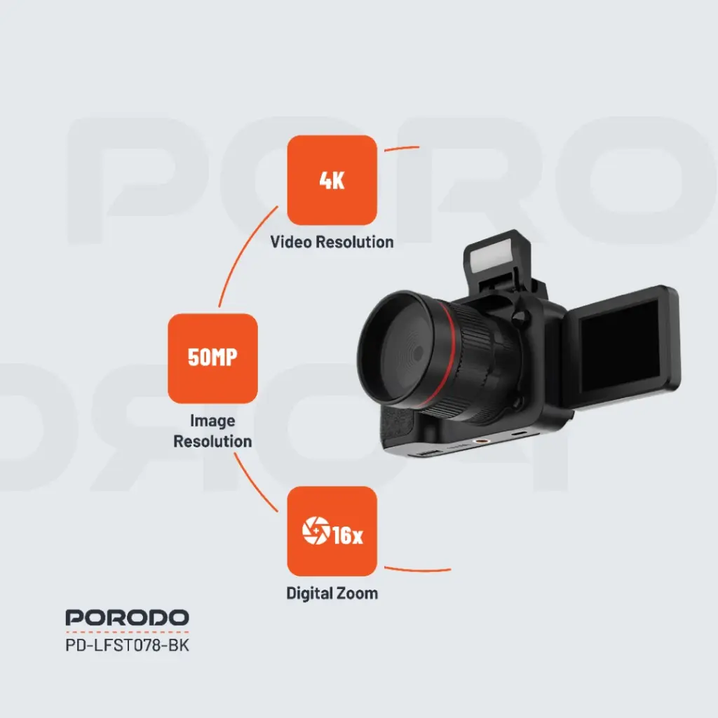 Porodo Lifestyle Digital Camera 16X Zoom | Flip Flash - Black