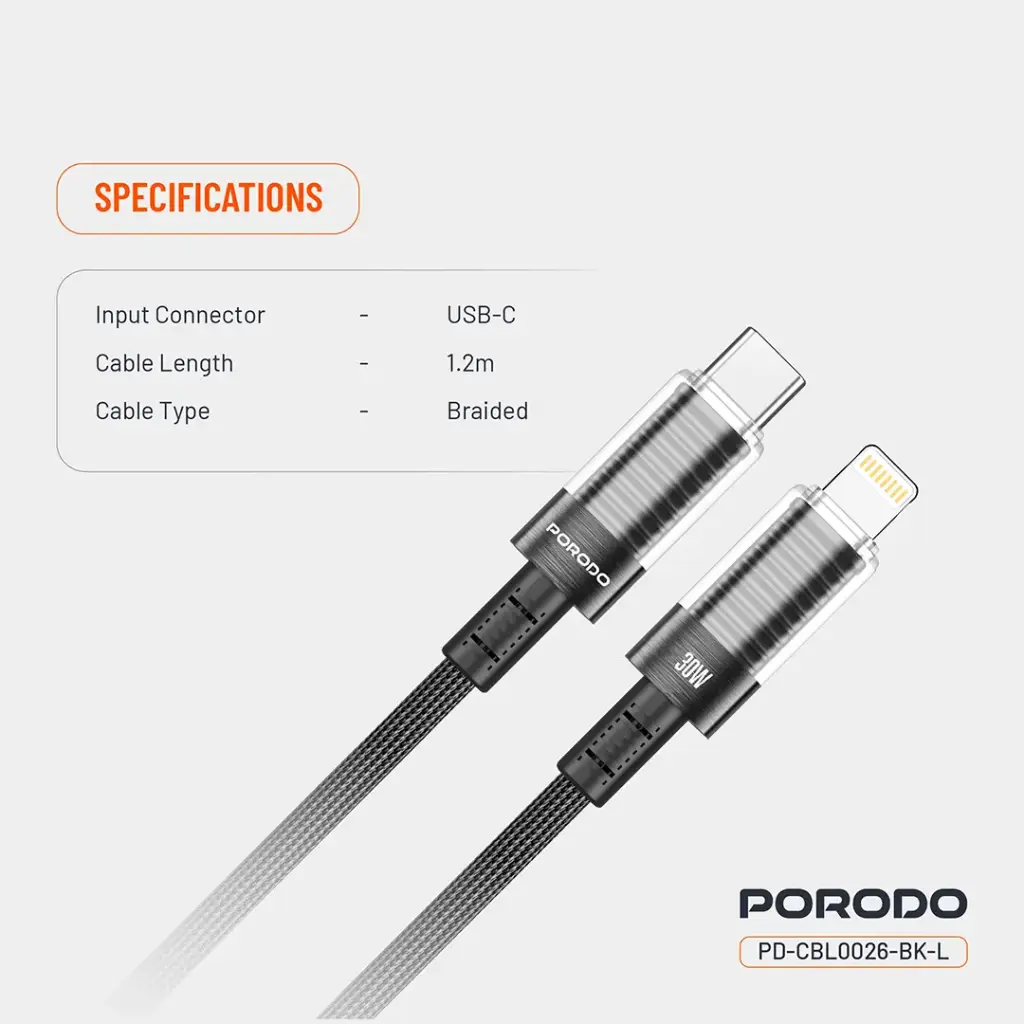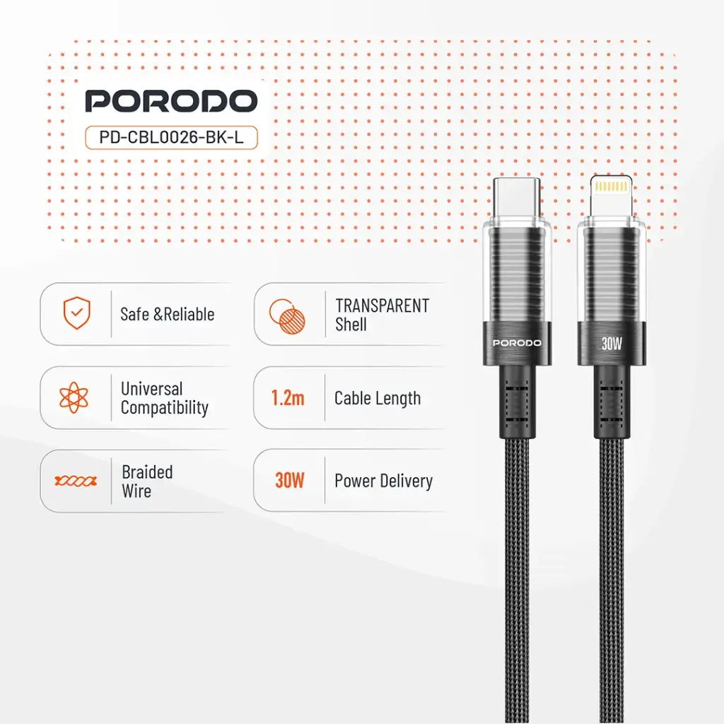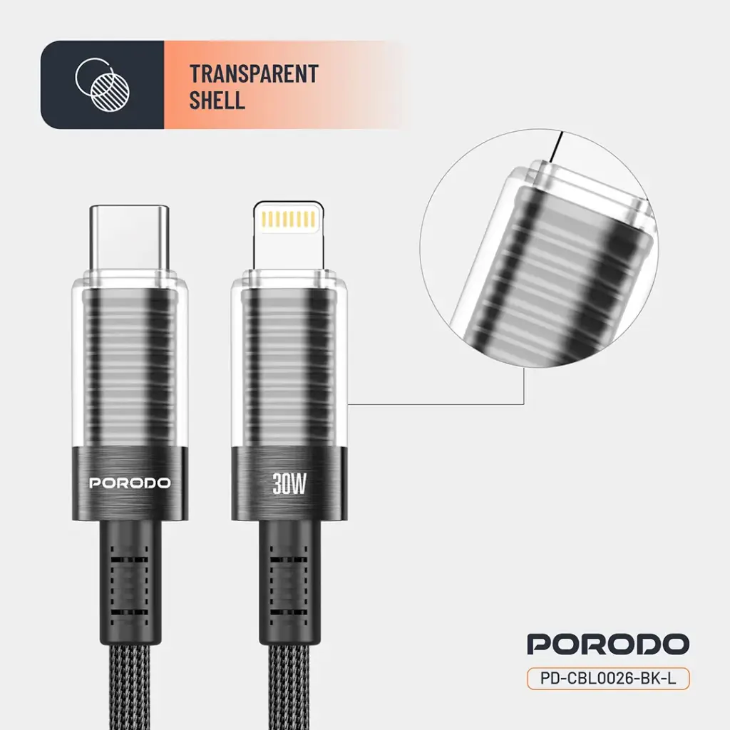Porodo Transparent Shell USB-C To Lightning Cable - Black