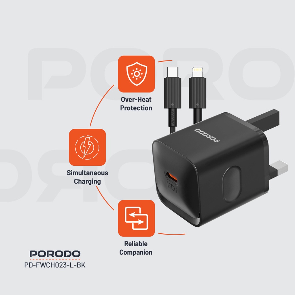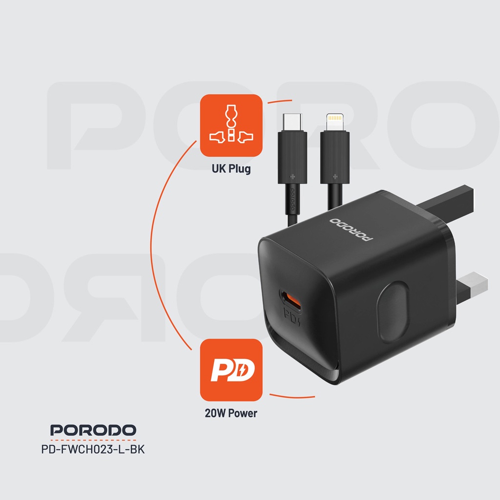 Porodo USB-C Power Delivery Wall Charger with Lightning Cable - Black