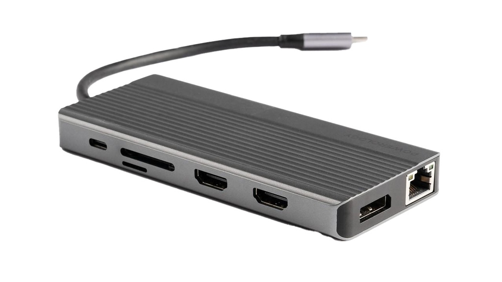 Powerology 13IN1 Dual HDMI & DP 4K USB-C Hub Ethernet is an all-in-one which helps you with more organized working table as it cuts down your need for extra cables and ports. By connecting to your device through a USB-C PD100W Input, it provides you with 13 different Outputs, including 4 USB-Cs 3.2 with 10Gbps high-speed data transfer, multiple HDMI Ultra-HD ports that enable you to connect 3 displays all at once, one 3.5mm AUX audio jack, and SD and Micro-SD memory carts port. Alongside these magnificent features, it is accompanied by RJ45 Ethernet connector which ensures fast, stable data transmission over Ethernet. This multi-purpose beneficial gadget is compatible with Android, iOS, Windows, Mac, making it a universal device suitable for all gamers and professionals who are always in need of extra ports and space.