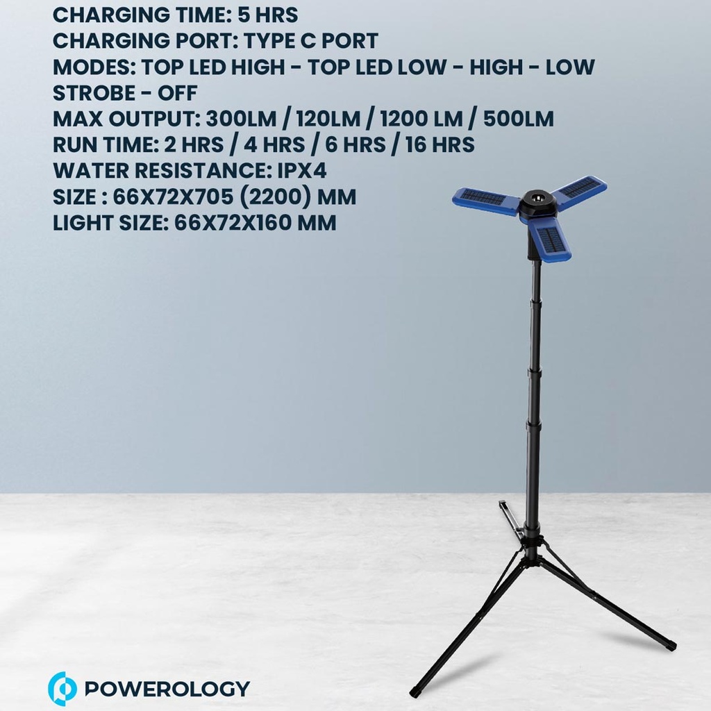 The Powerology 2600mAh Camping Light with Tripod Stand and Built-in Solar Panels is a versatile and eco-friendly outdoor lighting solution. With four different lighting modes to choose from—Top LED High, Top LED Low, High, and Low—you can adapt the illumination to your specific needs, ranging from a maximum output of 1200LM to a minimum of 120LM. Its long-lasting performance allows for runtimes of 2 hours, 4 hours, 6 hours, or an impressive 16 hours, depending on your chosen mode. The 180° magnetic headlamp feature adds flexibility and convenience to your lighting setup, while the SMD bulb provides a clean and bright 6000-7000K light. Powered by a 3.7V 2600mAh battery and equipped with built-in solar panels, this camping light ensures you have a reliable source of light even in remote locations. With an IPX4 water resistance rating, it's built to withstand outdoor conditions. With a maximum height of 220cm and an adjustable head, you can position the light exactly where you need it, making it an ideal choice for camping and outdoor activities. The Powerology Camping Light combines efficiency and versatility for a well-lit and enjoyable outdoor experience.
