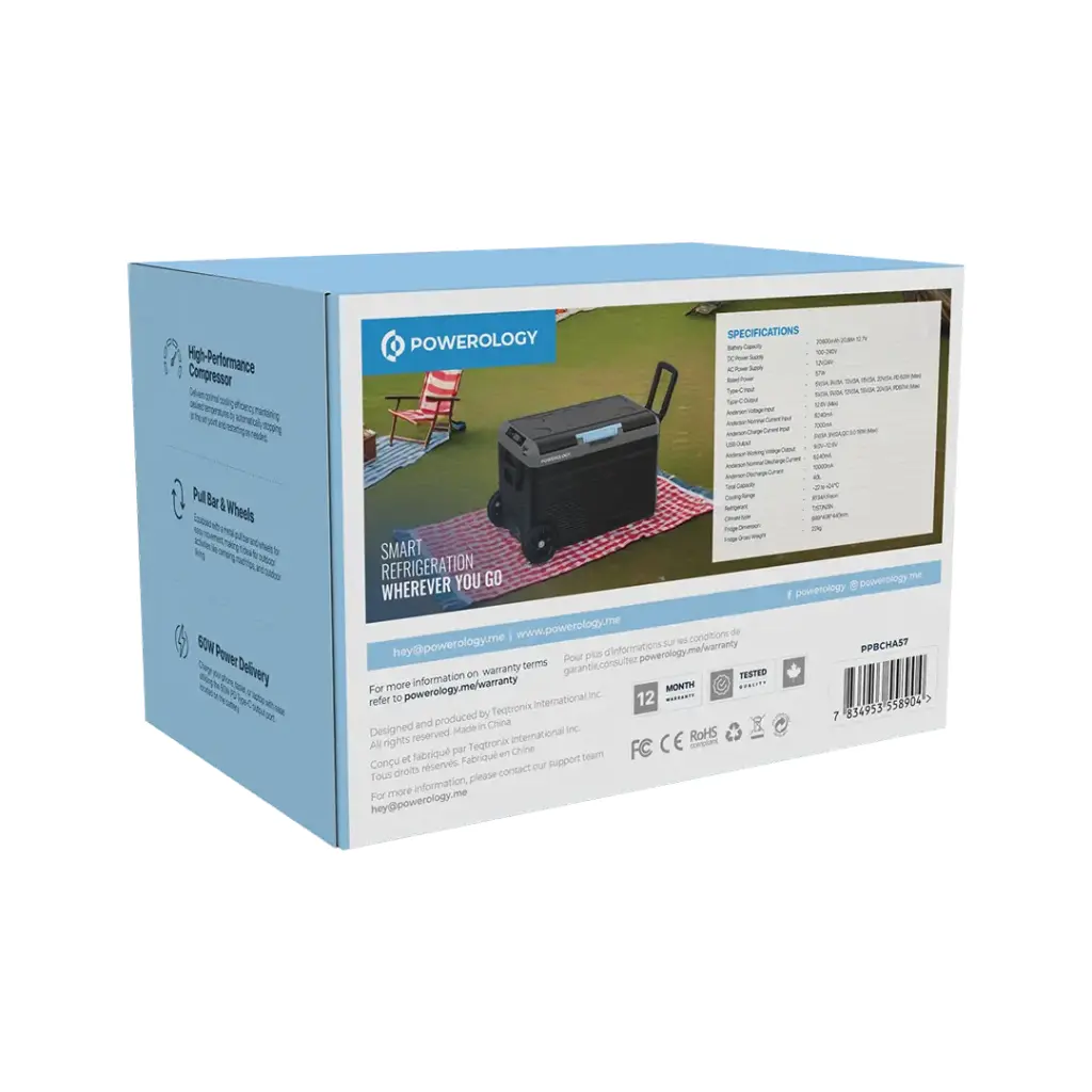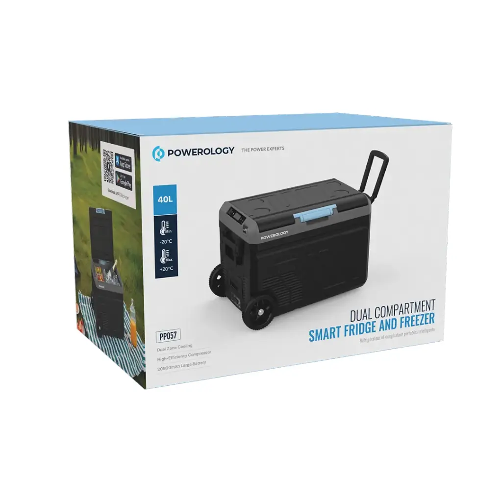 Powerology Dual Compartment Smart Fridge and Freezer feature versatile and efficient cooling, and with its total capacity of 40L, your items can be used at optimal temperatures between -20°C and +20°C. Equipped with a robust 20800mAh battery, it supports AC (100-240V), DC (12V/24V), and Type-C inputs with PD60W max for flexible indoor and outdoor use. It comes equipped with dual-zone cooling, allowing you to simultaneously store frozen and refrigerated items. It has a high-efficiency compressor for consistent performance and is filled with R134A Freon to keep cooling efficiency. This portable fridge comes with a pull bar and wheels, which makes it ideal for camping, a road trip, or an off-grid adventure. The QC 3.0 USB output and Anderson voltage inputs allow for easy charging and providing power, while the solution presented here is complete for your cooling and power needs.