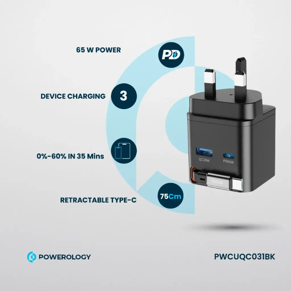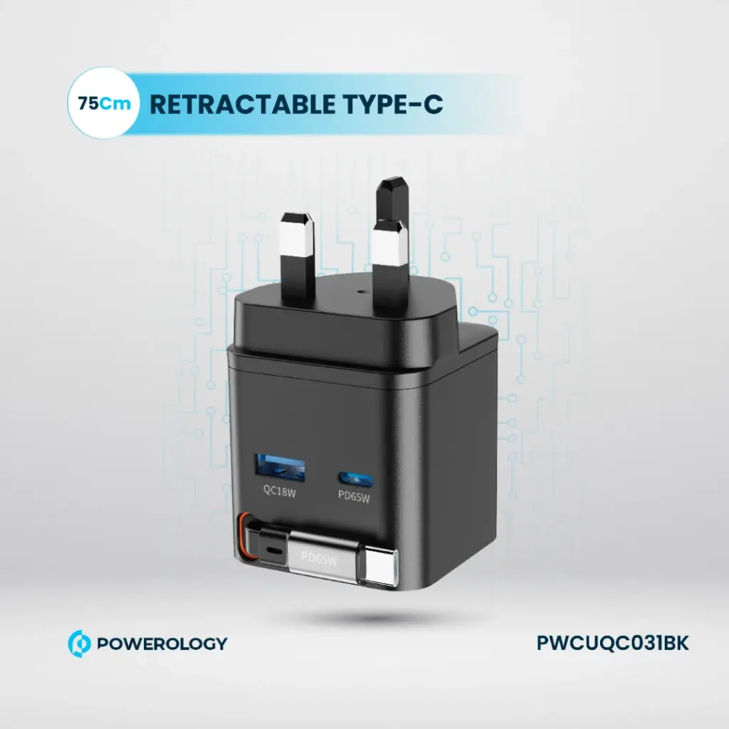 The Powerology Dual Port retractable GaN charger is a versatile, high-performance charging solution that can quickly charge multiple devices. The maximum output it has is 65W for fast-charging USB-C and USB-A. Here, the cable and port provide an output of 65W effortlessly, adding a fast charge feature for laptops, tablets, and smartphones with up to 18W max through the USB-A port for other devices. When plugged into all ports simultaneously, there will be a combined output of 65W, with guarantees of charging for three devices simultaneously. The retractable Type-C cable is 75 cm, which adds convenient portability by keeping it organized and tangle-free. Fireproof matte PC material is used in construction, ensuring safety but not breaking down over time. Other features, such as built-in safeguards against overheating, overcharging, and short circuits, support this. Its patented design and UK 3-pin plug give it that extra touch of style with practicality. This charger can power devices from 0% to 60% in only 35 minutes, making it the ideal charger for fast, safe, and reliable power at home or on the go.