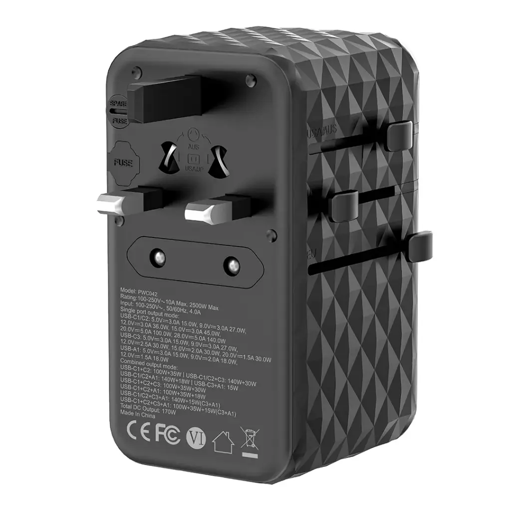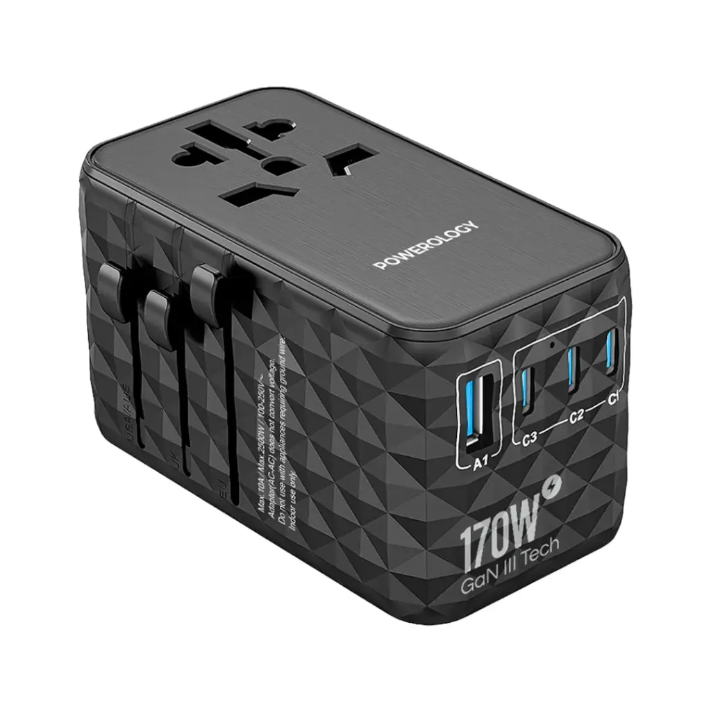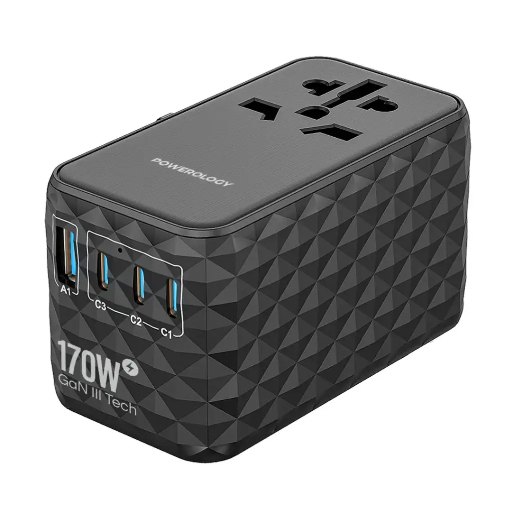 Powerology GaN 170W Universal Charger with 4-Ports Fast Charging + AC is the next-generation, high-power charger that meets the requirements of the modern device. The charger is feather-light, compact, and heavy-duty with GaN (Gallium Nitride) technology and charges rapidly with fast heat dissipation. The charger has a cumulative DC output of 170W for charging up multiple devices simultaneously, such as laptops, smartphones, tablets, etc. It has four individual ports—two USB-C, one USB-A, and one AC port—offering easy charging amenities. USB-C1 and C2 are exclusively for high-capacity charging of 140W, whereas USB-C3 and USB-A1 offer 30W and 18W, respectively. The laptop battery could be charged from 0% to 60% within 35 minutes. It has support for over 150 countries and thus is a perfect travel friend. The clever design of the charger also has an additional fuse to safeguard it, and therefore, it is a high-power, efficient, and convenient charger to charge your device on the move. The Powerology GaN 170W Universal Charger gives you power and connectivity anywhere, whether at the office, at home, or on the move.