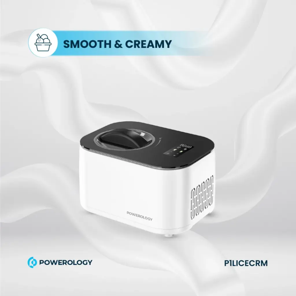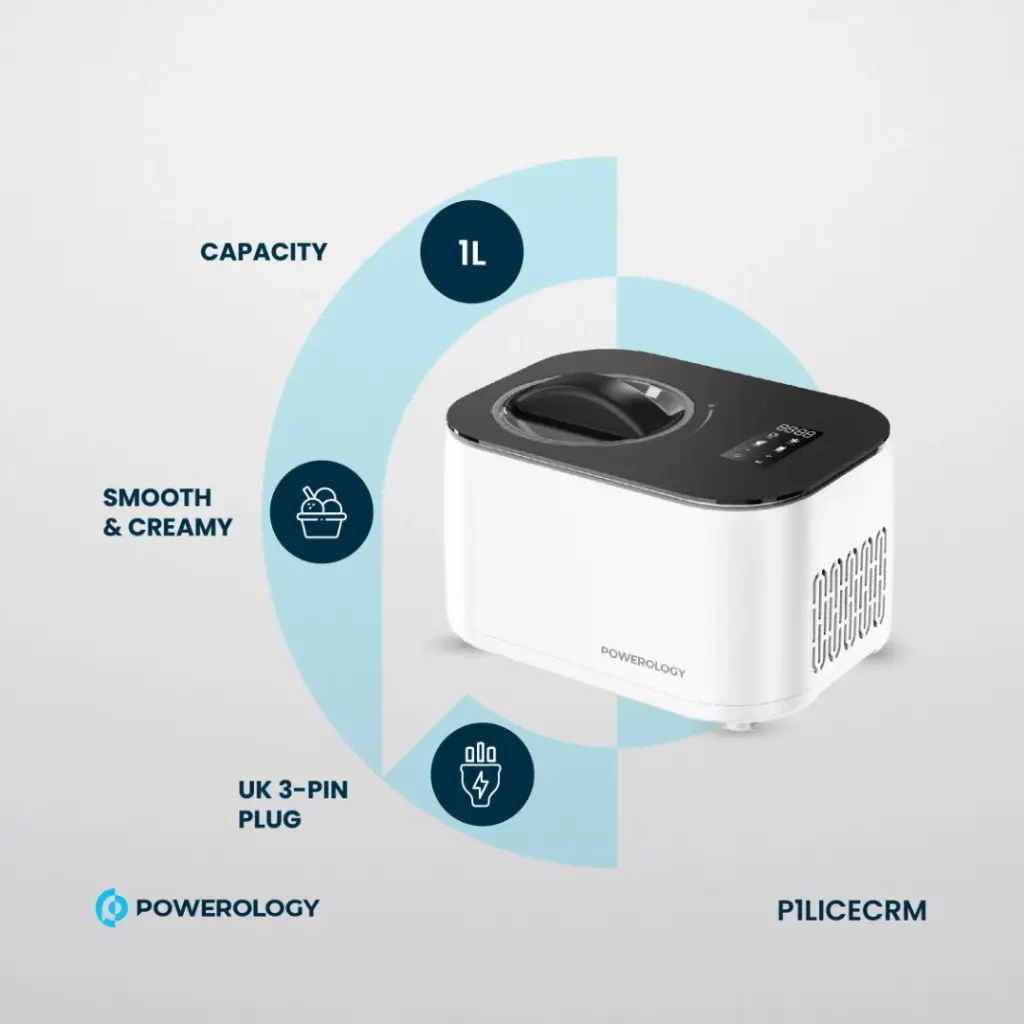 Powerology makes it easy for this high-performance unit to prepare delicious homemade ice cream, frozen yogurt, and sorbet. It is capable of holding a liter of preparation for the whole family. Enhancing the freezing capability into a high-power compressor where preparation time is reduced between 50-60 minutes with instant freeze technology ensures a smooth and creamy texture. Its silent operation makes it ideal for household use without noise pollution. It has four mixing modes to make different frozen desserts: Rich ice cream, refreshing frozen yogurt, and dairy-free sorbets. Works with a rated voltage of AC 220-240V standard 3-pin UK plug for wall outlet compatibility, optimum cooling power of 100 W, and heating power of 22.5 W. The Powerology Ice Cream Maker, designed for convenience, is also user-friendly, allowing users to create professional-quality products at home. If you want to create interesting flavor combinations or stick to classic ice cream recipes, this electric dessert maker offers an effortless experience.