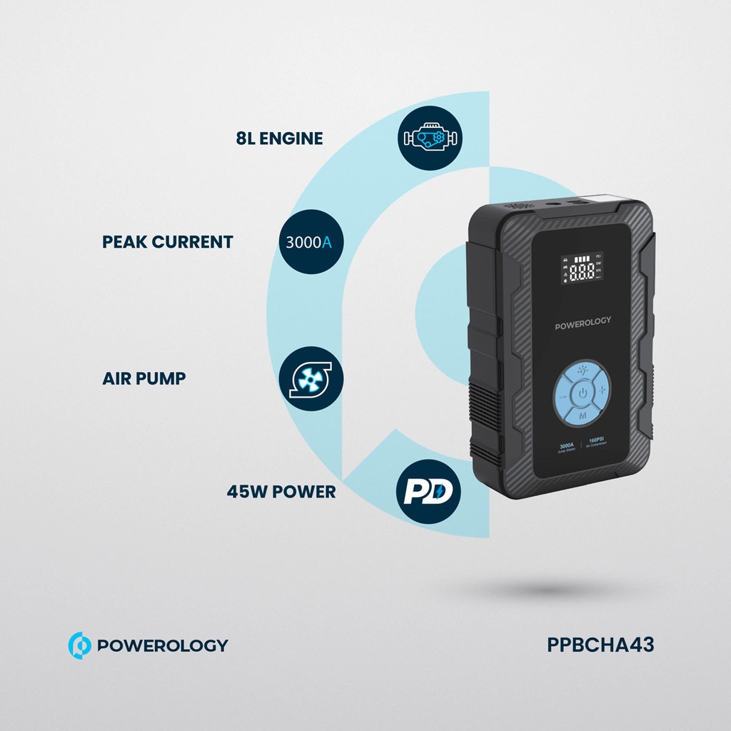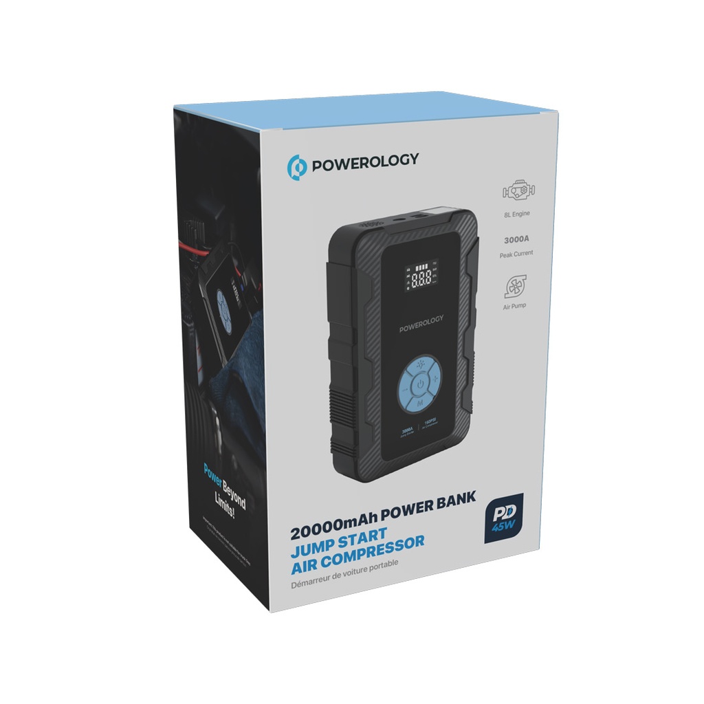Be prepared for any roadside emergency with the Powerology Jumpstart with Air Pump. This device is capable of jumpstarting engines up to 8L with a peak current of 3000A. It also features a powerful air pump that can inflate up to 160 psi, making it perfect for tires and sports equipment. With a 20000mAh (74Wh) battery capacity, it offers plenty of power, and the PD 45W charging input/output ensures quick recharges. The device includes a USB output of 18W for additional charging needs. The air pressure sensor accuracy is within ±1psi, and it operates quietly at 80dB. With an operating temperature range for charging from 0°C to 45°C and discharging from -10°C to 45°C, this versatile tool is perfect for various environments. The inflatable tube length of 435mm ensures ease of use. Compact and efficient, this jumpstart kit is an essential tool for your car, ensuring you’re never stranded.
