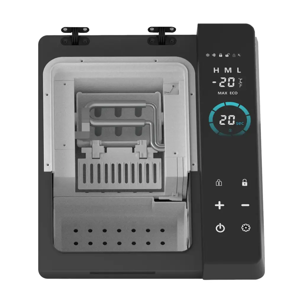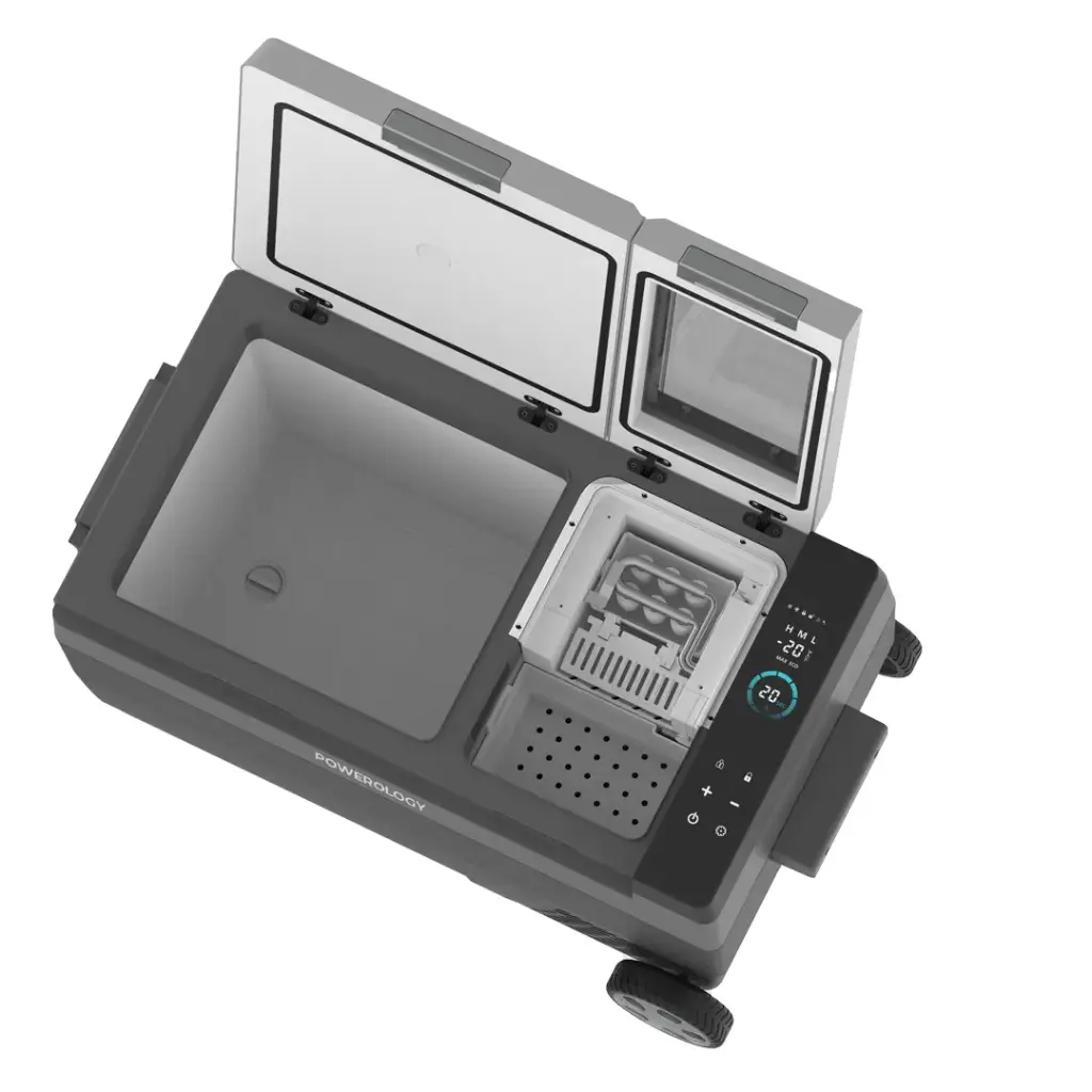 Portable Outdoor Fridge and Ice Maker Powerology is no exception and can be used for every cooling device on the road or even during sporadic camping trips. This compressor can run efficiently at cooling levels from -20 degrees to possibly up to +20 degrees Celsius—just enough to keep food fresh and drinks wringing along with it. These are also AC (100-240V) or DC (12/24) mode-compatible portable refrigerators, so it is very convenient to bring them home and use them on the road or place them outside, depending on individual needs. This built-in ice maker produces six ice cubes every 8 to 9 minutes, so you do not have to keep pouring ice into that drink. The control panel has a child lock to provide safety and convenience. The fridge is made for effortless mobility using a pull bar and wheels. The anti-vibration construction also keeps the refrigerator stable on uneven surfaces. Get the goods under LED interior lighting, even in low light. Rely on it for easy runs as the Powerology Portable Outdoor Fridge and Ice Maker get portable cooling needs for travel, camping, or daily roles. It is made from tough, durable ABS material and uses the safe R134a refrigerant for performance that is both reliable and energy efficient.