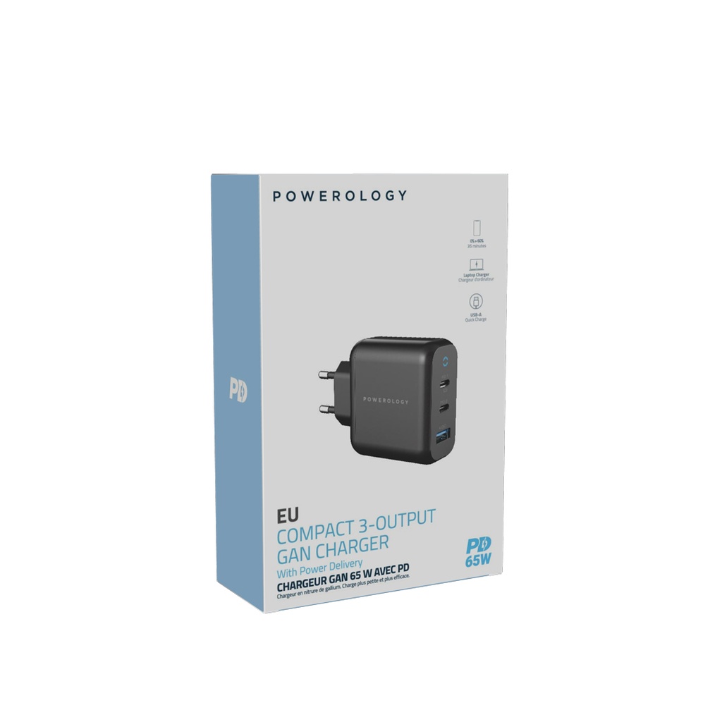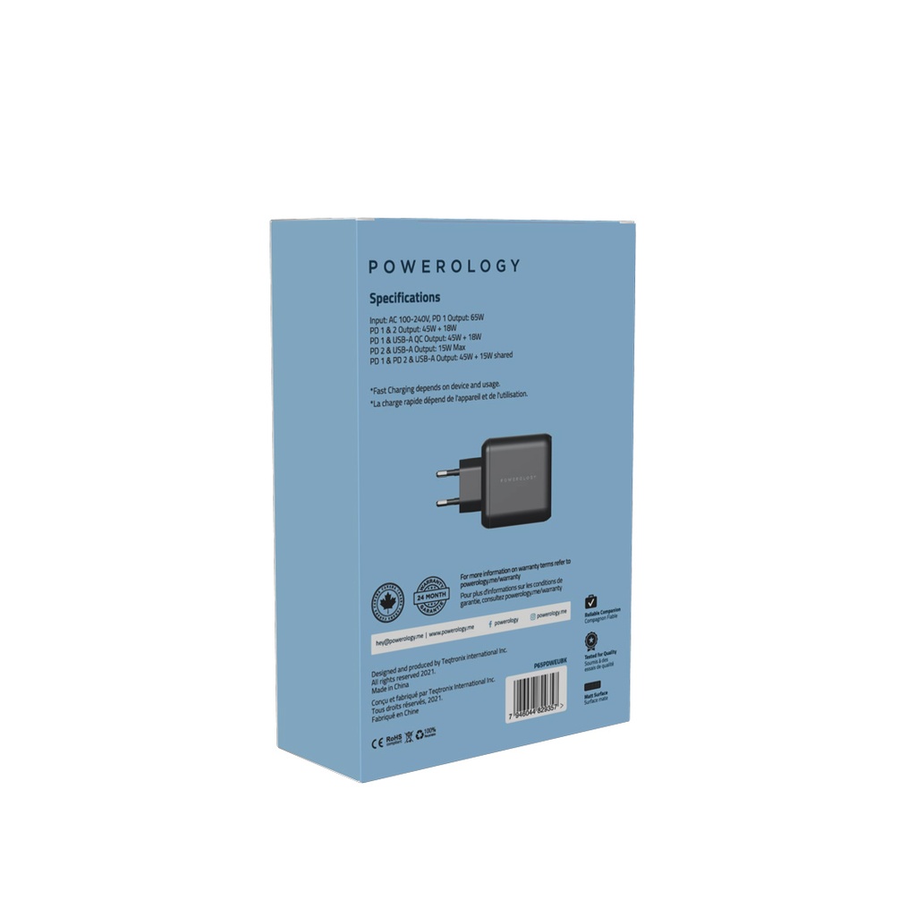 Ergonomic design, great value features, and active protection, find them all in the Powerology 65W GaN charger. Two separate type-C ports have been designed in this wall charger which gives you the option to connect more devices at the same time.Handy design in order easy carrying option. Use all the ports at the same time and let your devices enjoy fast charging technology. LED indicators will light up whenever it connects to the power.