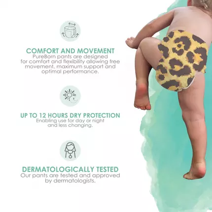 PureBorn pants are dermatologically tested and carefully formulated to protect the environment and children’s sensitive skin. We have replaced much of the plastic materials (that you find in standard nappies) with sustainable materials that are not only kinder to your baby’s skin but also helps to protect your child’s world of tomorrow.