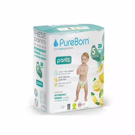 PureBorn pants are dermatologically tested and carefully formulated to protect the environment and children’s sensitive skin. We have replaced much of the plastic materials (that you find in standard nappies) with sustainable materials that are not only kinder to your baby’s skin but also helps to protect your child’s world of tomorrow.