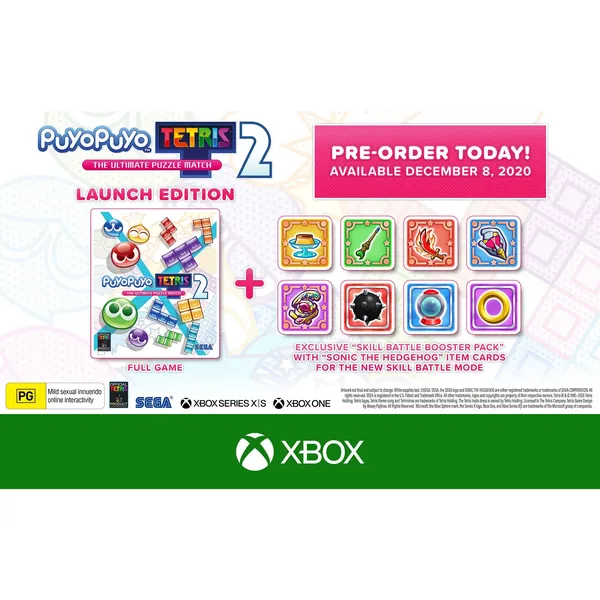 Japan’s beloved puzzle game series Puyo Puyo and the world-renowned Tetris® game franchise have teamed up again to deliver even more Puyo-popping and Tetrimino-clearing fun in Puyo Puyo Tetris 2. Playing is easy: match 4 or more same-coloured Puyos or complete a line of blocks to clear them from your board and dump Garbage into your opponent’s game. But keep an eye on what’s coming your way too.