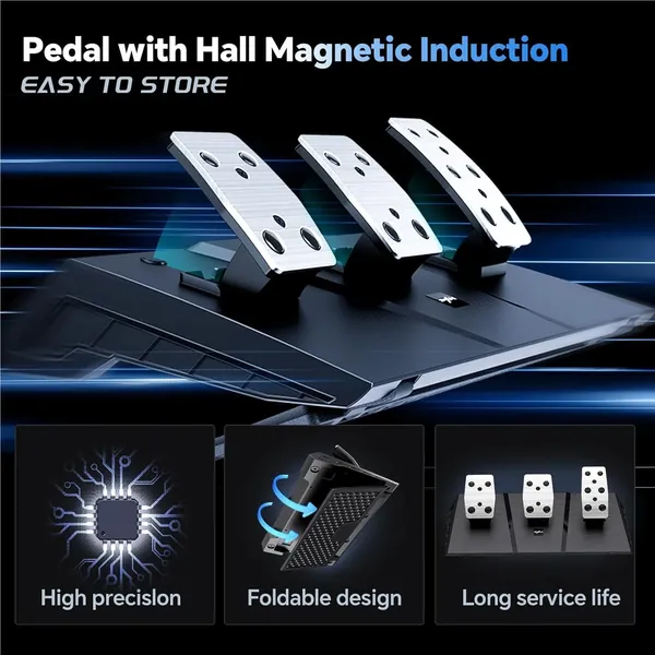 • Hall Effect Pedals: Utilizing Hall effect sensor technology, the pedals offer high precision and excellent linearity, accurately detecting foot pressure for a more responsive and accurate racing experience. The textured pedals and anti-slip design on the bottom ensure stable operation without shifting. The steering wheel features pedal indicator lights, and two RGB light strips on the wheel provide real-time feedback based on throttle and brake input.
