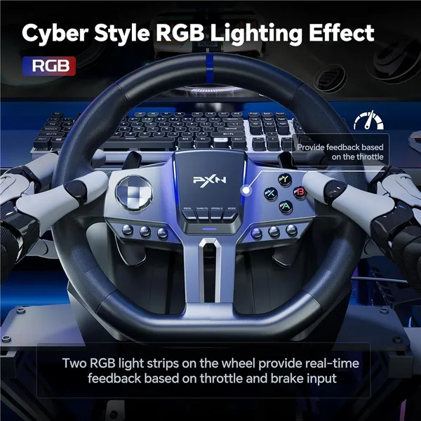 • 270&900 Rotation: A physical button allows for easy and flexible switching between 270-degree and 900-degree rotation angles. The 900-degree setting is ideal for driving simulation games like Euro Truck Simulator and American Truck Simulator. The 270-degree setting is perfect for racing games such as Need for Speed, Forza Horizon 4, and GTA 5.