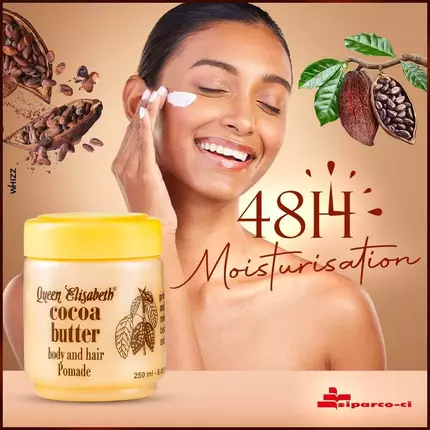 Queen Elisabeth cocoa butter pomade is a blend of natural cocoa butter a pure pomade base. This pomade provides protection against the drying, harmful effect on the sun and the wind, and helps your skin and hair regain essential moisture. It will leave your skin feeling soothed and perfume with the delicate Queen Elisabeth fragrance.