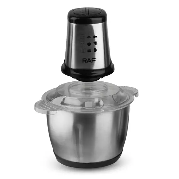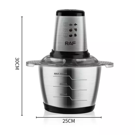 Features An electric food chopper merely takes 4-6 seconds to crush 2 lbs. of meat with 1000-watt power. 3L large food processor is large enough to prepare meals for an entire family. It has a stainless steel bowl, which doesn't trap food particles and moisture as much as the bowl with plastic. This Electric Meat Chopper All detachable parts are easy to operate by hand. Two convenient and comfortable grips for easy movement. Multiple function to grind meat, chop vegetable and fruit Long-lasting, ultra-sharp double layer-blade Food grade stainless steel bowl 2 L Easy press operation Overheat Protection Specifications: Brand Name: RAF Model Number: R.7034 Power Source: Electric Housing Material: Stainless steel Power (W): 1000 Voltage (V): 220 Material: food grade PET PP, plastic, stainless steel Bowl capacity: 3L Stainless Steel Power cord: 1.2m power cord (the inner core is 12*15 copper clad steel) Operation Type: Press Button Control