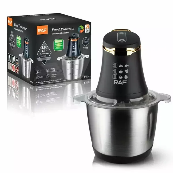 The RAF Chopper R.7035 is a powerful 1000W electric food processor designed for efficiency and durability. Its 3L stainless steel bowl and ultra-sharp blades make quick work of chopping, grinding, and preparing family-sized meals with easy press-button operation.