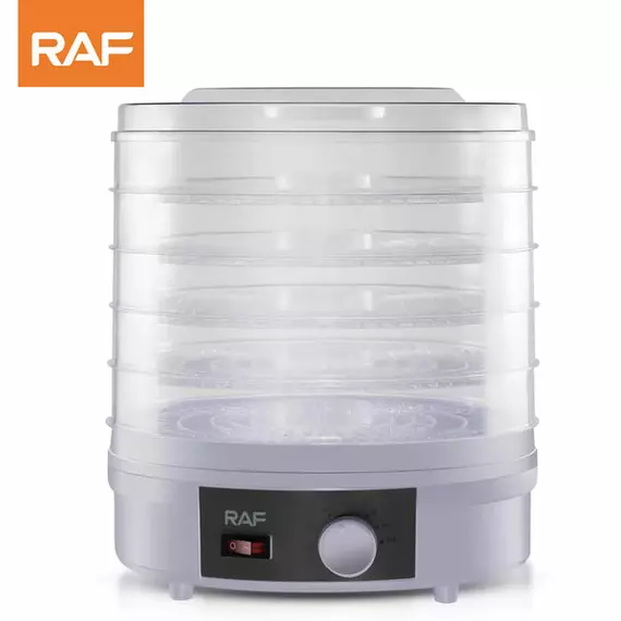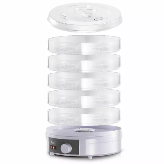 Nutrient dehydrator RAF R.6800 is an indispensable assistant for those who appreciate healthy food and want to preserve the beneficial properties of vegetables and fruits. With its 5 tiers and 350W power, it ensures efficient drying while preserving vitamins and minerals. Features: Multi-level drying: 5 levels allow you to dry different products at the same time, saving time and energy. Adjustable temperature: Select the heating temperature from 35 to 70 °C for optimal processing of different ingredients. Overheating protection: Built-in overheating protection system ensures safe use. Heavy load: Each tier holds up to 1 kg of products, providing extensive drying capabilities. Use of safe materials: Food-grade plastic and metal ensure that products remain clean and safe during drying. Reliable power supply: Operates from 220-240V/50-60Hz mains for stable and efficient operation. Characteristics: Brand Name: RAF Model Number: R.6800 Power: 350 W Function: Drying Fruits & Vegetables Energy Efficiency Rating: Class A Choice of heating temperature: 35 - 70 °C Protection against overheating Number of tiers for drying: 5 Layers Load: up to 1 kg per tier Material: ABS, metal. Power supply: 220-240V/50-60Hz